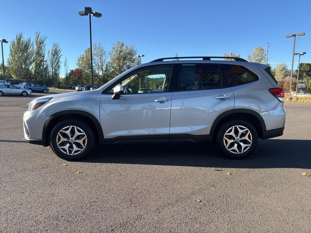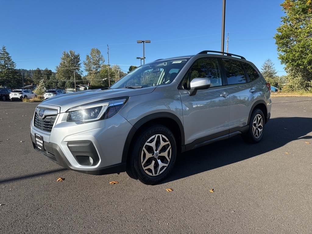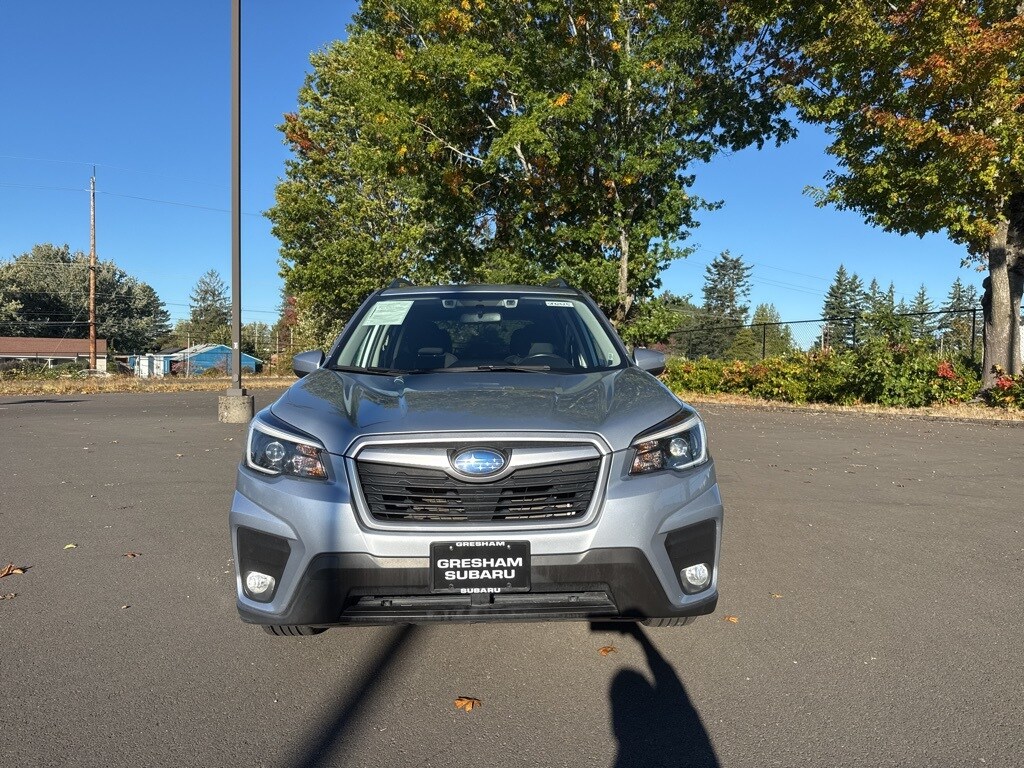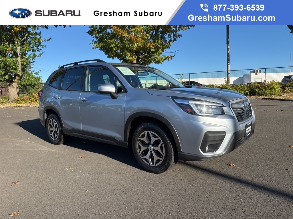 Driver's Seatback Divided Pocket, Multi-Function High Grade Display, Power Rear Gate w/Automatic Close & Height Memory, 3.70 Axle Ratio, 4-Wheel Disc Brakes, 6 Speakers, ABS brakes, Air Conditioning, Alloy wheels, AM/FM radio: SiriusXM, Auto High-beam Headlights, Automatic temperature control, Brake assist, Bumpers: body-color, CD player, Cloth Upholstery, Driver door bin, Driver vanity mirror, Dual front impact airbags, Dual front side impact airbags, Electronic Stability Control, Emergency communication system: STARLINK Safety and Security (Subscription Required), Exterior Parking Camera Rear, Four wheel independent suspension, Front anti-roll bar, Front Bucket Seats, Front Center Armrest, Front fog lights, Front reading lights, Fully automatic headlights, Heated door mirrors, Heated Front Bucket Seats, Heated front seats, Illuminated entry, Knee airbag, Low tire pressure warning, Occupant sensing airbag, Outside temperature display, Overhead airbag, Overhead console, Panic alarm, Passenger door bin, Passenger vanity mirror, Power door mirrors, Power driver seat, Power moonroof: Panoramic, Power steering, Power windows, Radio data system, Radio: Subaru Starlink 6.5" Multimedia Plus System, Rear anti-roll bar, Rear seat center armrest, Rear window defroster, Rear window wiper, Remote keyless entry, Roof rack: rails only, Security system, Speed control, Speed-sensing steering, Split folding rear seat, Spoiler, STARLINK/Apple CarPlay/Android Auto, Steering wheel mounted audio controls, Tachometer, Telescoping steering wheel, Tilt steering wheel, Traction control, Trip computer, Variably intermittent wipers, Wheels: 17" x 7.0J Black Machine Finish Alloy, Blind Spot Detection (BSD), Blind Spot Detection w/RCTA & Power Rear Gate, Driver's Seatback Divided Pocket, Multi-Function High Grade Display, Power Rear Gate w/Automatic Close & Height Memory. 2021 Subaru Forester Premium 4D Sport Utility 2.5L 4-Cylinder DOHC 16V VVT Lineartronic CVT AWD Silver Subaru Certified Pre-Owned Details: