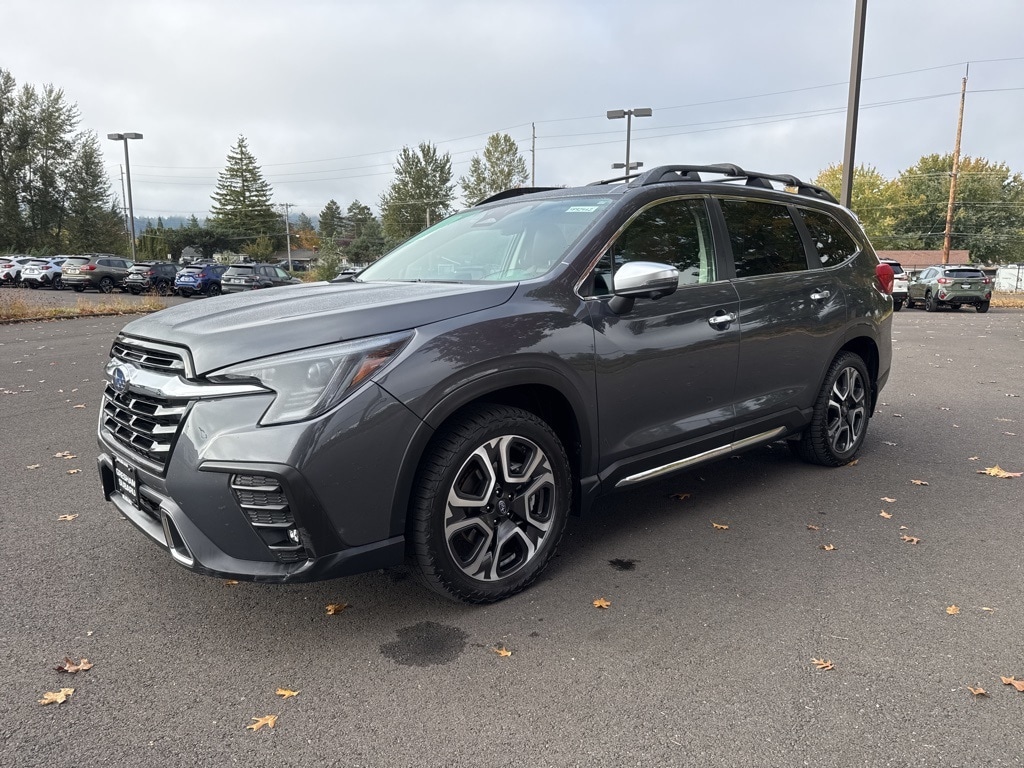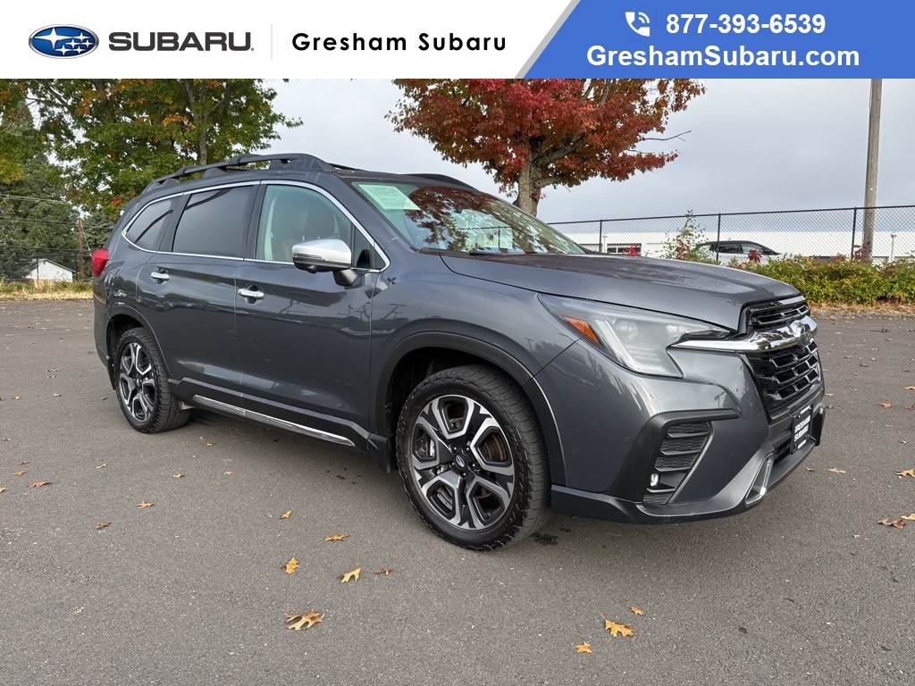 14 Speakers, 3rd Row Bench Rear Seatback Protector, 3rd row seats: bench, 4-Wheel Disc Brakes, ABS brakes, Aero Crossbar Set, Air Conditioning, All-Weather Floor Liners, Alloy wheels, AM/FM radio: SiriusXM, Auto High-beam Headlights, Auto-Dimming Exterior Mirror w/Approach Light, Auto-dimming Rear-View mirror, Automatic temperature control, Axle Ratio: 4.44, Brake assist, Bumpers: body-color, Cargo Net, Compass, Delay-off headlights, Driver door bin, Driver vanity mirror, Dual front impact airbags, Dual front side impact airbags, Electronic Stability Control, Emergency communication system: STARLINK Safety and Security (Subscription Required), Four wheel independent suspension, Front anti-roll bar, Front Bucket Seats, Front Center Armrest, Front dual zone A/C, Front fog lights, Front reading lights, Fully automatic headlights, Garage door transmitter: HomeLink, harman/kardon® Speakers, Heated & Ventilated Front Bucket Seats, Heated door mirrors, Heated front seats, Heated rear seats, Heated steering wheel, HVAC memory, Illuminated entry, Knee airbag, Leather Shift Knob, Leather steering wheel, Low tire pressure warning, Memory seat, Navigation System, Occupant sensing airbag, Outside temperature display, Overhead airbag, Overhead console, Panic alarm, Passenger door bin, Passenger vanity mirror, Perforated Nappa Leather-Trimmed Upholstery, Power door mirrors, Power driver seat, Power Liftgate, Power moonroof, Power passenger seat, Power steering, Power windows, Radio data system, Radio: Subaru STARLINK 11.6" Multimedia Nav System, Rain sensing wipers, Rear air conditioning, Rear anti-roll bar, Rear Bumper Cover, Rear reading lights, Rear window defroster, Rear window wiper, Reclining 3rd row seat, Remote keyless entry, Security system, Speed control, Speed-sensing steering, Splash Guards, Split folding rear seat, Spoiler, Standard Model, STARLINK/Apple CarPlay/Android Auto, Steering wheel mounted audio controls, Tachometer, Telescoping steering wheel, Tilt steering wheel, Traction control, Trip computer, Turn signal indicator mirrors, Variably intermittent wipers, Ventilated front seats, Wheels: 20" x 7.5 J Dk Gray Alloy w/Machine Finish. 2023 Subaru Ascent Touring 4D Sport Utility 2.4L 4-Cylinder DOHC 16V Lineartronic CVT AWD Gray Metallic Subaru Certified Pre-Owned Details:
