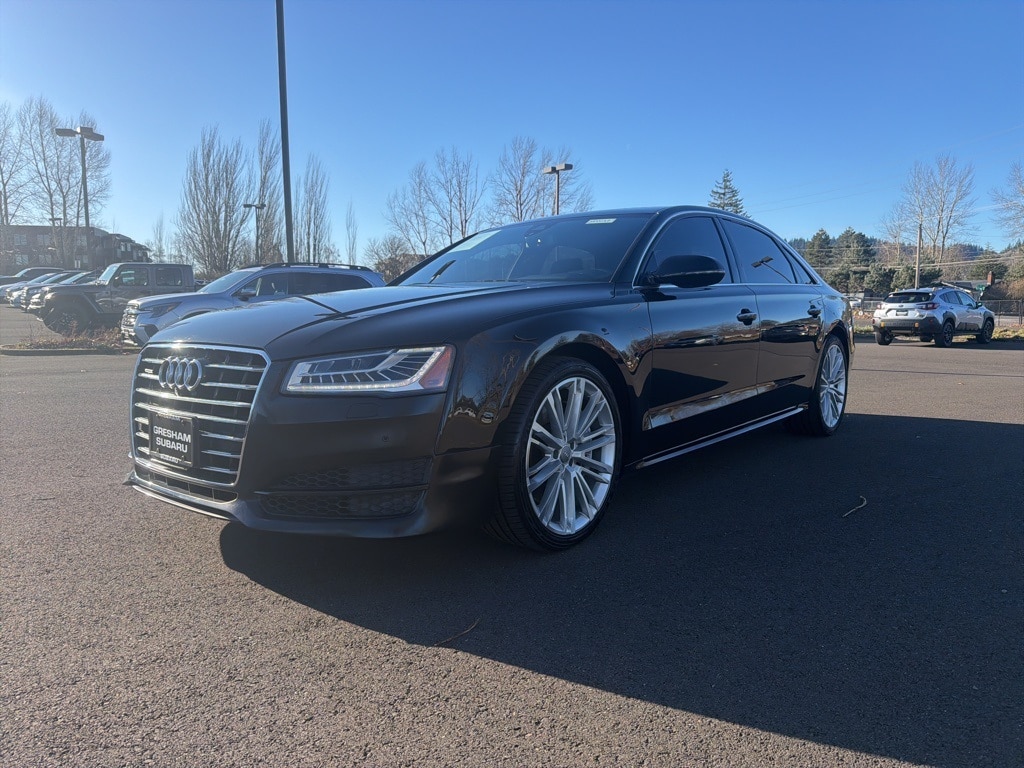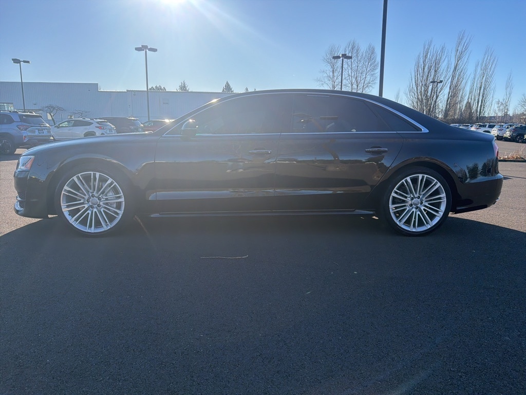 Black w/Valetta Leather Seat Upholstery or Valcona Leather Seat Upholstery, 14 Speakers, 18-Way Power Heated Front Seats w/Memory, 22-Way Power Heated Front Comfort Sport Seats, 4-Spoke Multifunction Heated Steering Wheel, 4-Wheel Disc Brakes, ABS brakes, Adaptive suspension, Air Conditioning, Alloy wheels, AM/FM radio: SiriusXM, Assam Gray Vavona Wood Upper Inlays, Audi First Aid Kit, Audi Guard All-Weather Floor Mats, Audi Head-Up Display, Audi Side Assist w/Pre Sense Rear, Auto tilt-away steering wheel, Auto-dimming door mirrors, Auto-dimming Rear-View mirror, Auto-leveling suspension, Automatic temperature control, Black Cloth Headliner, Bose Surround Sound System w/AudioPilot, Brake assist, Bumpers: body-color, CD player, Compass, Delay-off headlights, Door auto-latch, Driver door bin, Driver vanity mirror, Dual front impact airbags, Dual front side impact airbags, DVD-Audio, Electronic Stability Control, Executive Package, Exterior Parking Camera Rear, Four wheel independent suspension, Front anti-roll bar, Front Bucket Seats, Front dual zone A/C, Front fog lights, Front reading lights, Front Seat Ventilation with Massage, Garage door transmitter: HomeLink, Genuine wood console insert, Head restraints memory, Headlight cleaning, Heated door mirrors, Heated front seats, HVAC memory, Illuminated entry, Knee airbag, Leather Shift Knob, Leather steering wheel, Low tire pressure warning, Memory seat, Navigation System, Occupant sensing airbag, Outside temperature display, Overhead airbag, Overhead console, Panic alarm, Panoramic Sunroof, Passenger door bin, Passenger vanity mirror, Power adjustable front head restraints, Power door mirrors, Power driver seat, Power moonroof, Power passenger seat, Power steering, Power windows, Radio data system, Radio: Audi MMI Navigation Plus System, Rain sensing wipers, Rear air conditioning, Rear anti-roll bar, Rear dual zone A/C, Rear fog lights, Rear Heated Seats, Rear reading lights, Rear seat center armrest, Rear Seat Pass-Through, Rear side impact airbag, Rear Window Blind, Rear window defroster, Remote keyless entry, Seatbelt memory, Security system, Speed control, Speed-Sensitive Wipers, Steering wheel memory, Steering wheel mounted audio controls, Tachometer, Telescoping steering wheel, Tilt steering wheel, Topview Camera System (Front, Rear & Side Views), Traction control, Trip computer, Turn signal indicator mirrors, Valetta Leather Seat Upholstery, Variably intermittent wipers, Wheels: 9" x 21" Audi Sport 10-V-Spoke Design, Black w/Valetta Leather Seat Upholstery or Valcona Leather Seat Upholstery. 2017 Audi A8 L 3.0T quattro 4D Sedan 3.0L V6 Turbocharged DOHC 24V ULEV II 333hp 8-Speed Automatic with Tiptronic quattro Mythos Black Metallic