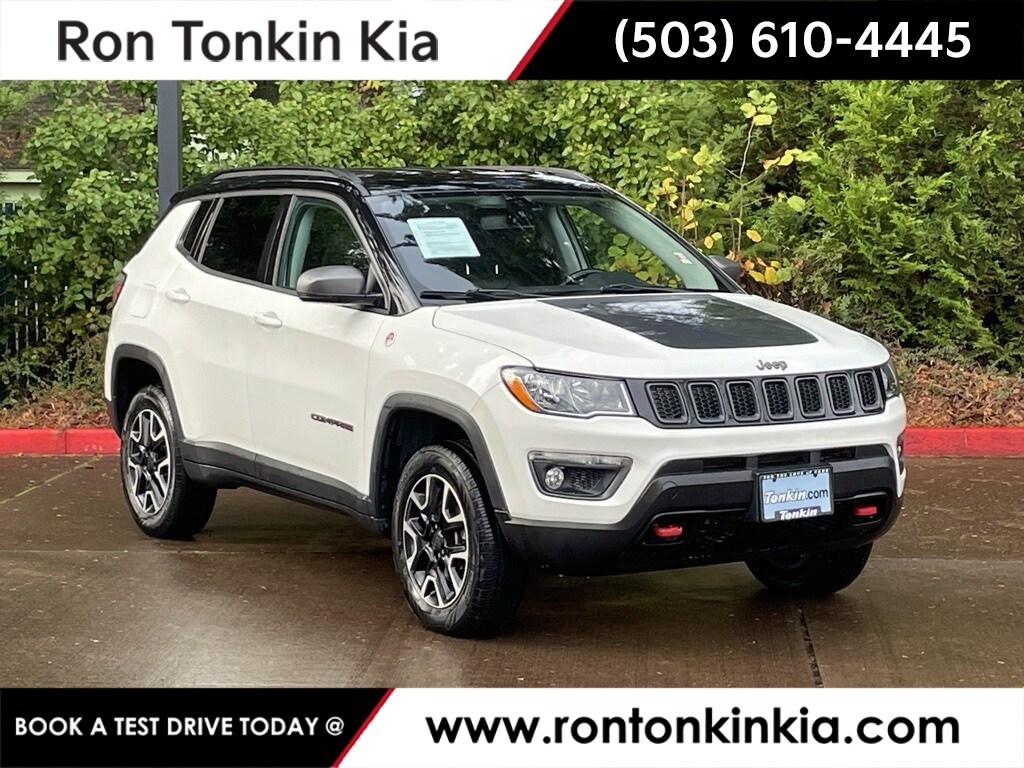 2020 Jeep Compass Trailhawk White Clearcoat 2.4L I4 17" x 6.5" Aluminum Wheels, 4-Wheel Disc Brakes, 4.334 Axle Ratio, 6 Speakers, 8.4" Touch Screen Display, ABS brakes, Air Conditioning, Air Vents Center Console/Rear Seats, Alloy wheels, AM/FM radio: SiriusXM, Anti-whiplash front head restraints, Apple CarPlay, Apple CarPlay/Android Auto, Automatic temperature control, Autostick Automatic Transmission, Bluetooth® Streaming Audio, Brake assist, Bumpers: body-color, Compass, Delay-off headlights, Driver door bin, Driver vanity mirror, Dual front impact airbags, Dual front side impact airbags, Electronic Stability Control, Four wheel independent suspension, Front anti-roll bar, Front Bucket Seats, Front Center Armrest w/Storage, Front dual zone A/C, Front fog lights, Front License Plate Bracket, Front reading lights, Fully automatic headlights, Google Android Auto, GPS Antenna Input, Heated door mirrors, Illuminated entry, Knee airbag, Leather Shift Knob, Leather Wrapped Shift Knob, Low tire pressure warning, Manufacturer's Statement of Origin (DISC), Media Hub (USB, AUX), Occupant sensing airbag, Outside temperature display, Overhead airbag, Overhead console, Panic alarm, ParkView Rear Back-Up Camera, Passenger door bin, Passenger vanity mirror, Power door mirrors, Power steering, Power windows, Premium Cloth/Leather Trim Bucket Seats, Quick Order Package 2GE, Radio: Uconnect 4 w/8.4" Display, Rear anti-roll bar, Rear seat center armrest, Rear window defroster, Rear window wiper, Remote keyless entry, Roof rack: rails only, Speed control, Split folding rear seat, Spoiler, Steering wheel mounted audio controls, Tachometer, Telescoping steering wheel, Tilt steering wheel, Traction control, Trip computer, Turn signal indicator mirrors, USB Host Flip, Variably intermittent wipers.