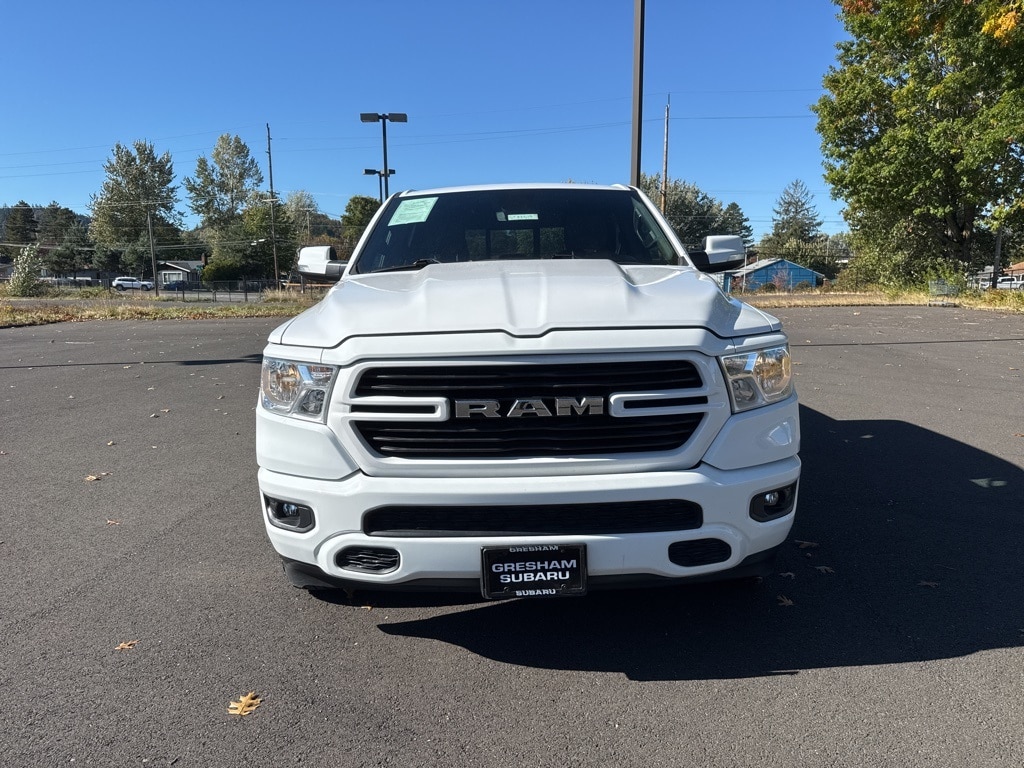 2nd Row In Floor Storage Bins, 3 Rear Seat Head Restraints, 3.21 Rear Axle Ratio, 3.92 Rear Axle Ratio, 4 Way Front Headrests, 4-Wheel Disc Brakes, 40/20/40 Split Bench Seat, 48V Belt Starter Generator, 6 Speakers, ABS brakes, Add Class IV Receiver Hitch, Air Conditioning, Alloy wheels, AM/FM radio, Anti-Spin Differential Rear Axle, Auto-Dimming Exterior Driver Mirror, Auto-Dimming Rear-View Mirror, Big Horn Badge, Big Horn Level 1 Equipment Group, Black Exterior Mirrors, Black Interior Accents, Black Premium Power Mirrors, Body Color Exterior Mirrors, Body Color Front Bumper, Body Color Premium Power Mirrors, Body Color Rear Bumper w/Step Pads, Brake assist, Bucket Seats, Bumpers: chrome, Center Console Parts Module, Class IV Receiver Hitch, Cloth Bench Seat, Cluster 3.5" TFT Color Display, Compass, Delay-off headlights, Deluxe Cloth Bucket Seats, Driver door bin, Dual front impact airbags, Dual front side impact airbags, Electronic Stability Control, Exterior Mirrors Courtesy Lamps, Exterior Mirrors w/Memory, Exterior Mirrors w/Supplemental Signals, Foam Bottle Insert (Door Trim Panel), For More Info, Call 800-643-2112, Front anti-roll bar, Front Center Armrest w/Storage, Front fog lights, Front License Plate Bracket, Front reading lights, Front Seat Back Map Pockets, Front wheel independent suspension, Full Length Floor Console, Fully automatic headlights, Glove Box Lamp, GPS Antenna Input, Heated door mirrors, Illuminated entry, Integrated Voice Command w/Bluetooth, Leather steering wheel, Low tire pressure warning, Manual Adjust 4-Way Front Passenger Seat, Manufacturer's Statement of Origin, Occupant sensing airbag, Outside temperature display, Overhead airbag, Overhead console, Panic alarm, ParkView Rear Back-Up Camera, Passenger door bin, Passenger vanity mirror, Power 4-Way Driver Lumbar Adjust, Power 8-Way Driver Seat, Power Adjustable Pedals, Power door mirrors, Power steering, Power windows, Power-Folding Mirrors, Quick Order Package 27Z Big Horn, Radio data system, Radio: Uconnect 3 w/5" Display, Radio: Uconnect 4 w/8.4" Display, Rear 60/40 Folding Seat, Rear anti-roll bar, Rear Dome w/On/Off Switch Lamp, Rear Power Sliding Window, Rear seat center armrest, Rear step bumper, Rear Window Defroster, Remote keyless entry, Remote Start System, SiriusXM Radio Service, SiriusXM Satellite Radio, Speed control, Split folding rear seat, Sport Appearance Package, Sport Decal, Steering wheel mounted audio controls, Sun Visors w/Illuminated Vanity Mirrors, Tachometer, Telescoping steering wheel, Tilt steering wheel, Traction control, Trailer Brake Control, Trailer Light Check, Trailer Reverse Steering Control, Trailer Tire Pressure Monitoring System, Trailer Tow Group, Trip computer, Universal Garage Door Opener, Variably intermittent wipers, Voltmeter, Wheels: 18" x 8" Cast-Aluminum Painted. 2021 Ram 1500 Big Horn/Lone Star 4D Crew Cab HEMI 5.7L V8 Multi Displacement VVT 8-Speed Automatic 4WD Bright White Clearcoat