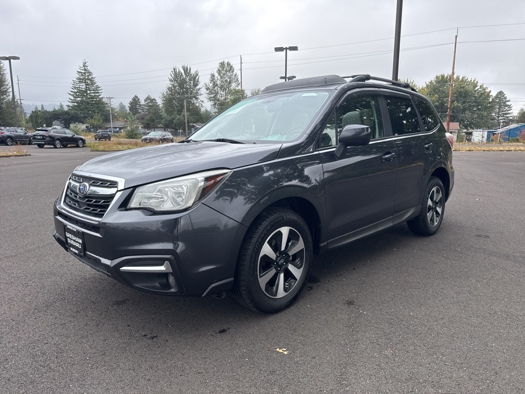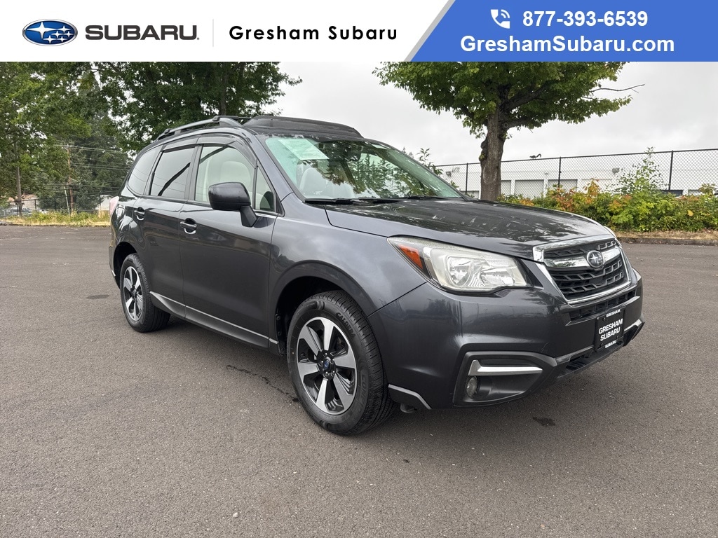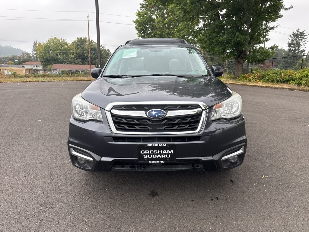 Blind Spot Detection w/Rear Cross Traffic Alert, EyeSight System, Heated Exterior Mirrors, Heated Front Seats, High Grade Instrument Cluster w/Color LCD Display, Steering Responsive Fog Lights (SRF), Windshield Wiper De-Icer, 17" Alloy Wheels, 3.70 Axle Ratio, 4-Wheel Disc Brakes, 6 Speakers, ABS brakes, Air Conditioning, Alloy wheels, AM/FM radio: SiriusXM, Automatic temperature control, Brake assist, Bumpers: body-color, CD player, Cloth Upholstery, Driver door bin, Driver vanity mirror, Dual front impact airbags, Dual front side impact airbags, Electronic Stability Control, Emergency communication system: STARLINK, Exterior Parking Camera Rear, Four wheel independent suspension, Front anti-roll bar, Front Bucket Seats, Front Center Armrest, Front reading lights, Illuminated entry, Knee airbag, Low tire pressure warning, Occupant sensing airbag, Outside temperature display, Overhead airbag, Overhead console, Panic alarm, Passenger door bin, Passenger vanity mirror, Power door mirrors, Power driver seat, Power moonroof, Power steering, Power windows, Radio data system, Radio: Subaru Starlink 7.0" Multimedia Plus System, Rear anti-roll bar, Rear seat center armrest, Rear window defroster, Rear window wiper, Remote keyless entry, Roof rack: rails only, Security system, Speed control, Split folding rear seat, Spoiler, Steering wheel mounted audio controls, Tachometer, Telescoping steering wheel, Tilt steering wheel, Traction control, Trip computer, Variably intermittent wipers, All-Weather Pkg & EyeSight & Blind Spot Detection, Blind Spot Detection w/Rear Cross Traffic Alert, EyeSight System, Heated Exterior Mirrors, Heated Front Seats, High Grade Instrument Cluster w/Color LCD Display, Steering Responsive Fog Lights (SRF), Windshield Wiper De-Icer. 2017 Subaru Forester 2.5i Premium 4D Sport Utility 2.5L 4-Cylinder DOHC 16V VVT Lineartronic CVT AWD Dark Gray Metallic Clean CARFAX.