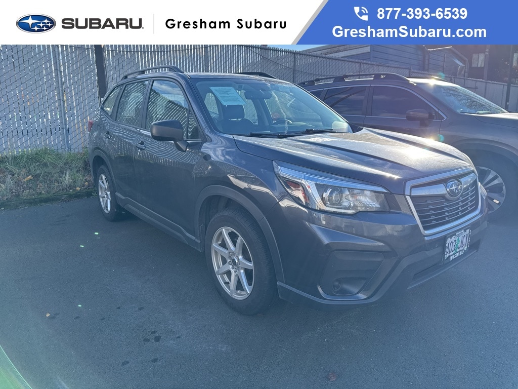 Recent Arrival! CARFAX One-Owner. 3.70 Axle Ratio, 4 Speakers, 4-Wheel Disc Brakes, ABS brakes, Air Conditioning, AM/FM radio: SiriusXM, Automatic temperature control, Brake assist, Bumpers: body-color, CD player, Cloth Upholstery, Driver door bin, Driver vanity mirror, Dual front impact airbags, Dual front side impact airbags, Electronic Stability Control, Exterior Parking Camera Rear, Four wheel independent suspension, Front anti-roll bar, Front Bucket Seats, Front Center Armrest, Front reading lights, Fully automatic headlights, Illuminated entry, Knee airbag, Low tire pressure warning, Occupant sensing airbag, Outside temperature display, Overhead airbag, Overhead console, Panic alarm, Passenger door bin, Passenger vanity mirror, Power door mirrors, Power steering, Power windows, Radio data system, Radio: Subaru Starlink 6.5" Multimedia Plus System, Rear anti-roll bar, Rear window defroster, Rear window wiper, Remote keyless entry, Security system, Speed control, Speed-sensing steering, Split folding rear seat, STARLINK/Apple CarPlay/Android Auto, Steering wheel mounted audio controls, Tachometer, Telescoping steering wheel, Tilt steering wheel, Traction control, Trip computer, Variably intermittent wipers, Wheels: 17" x 7.0J Steel w/Full Wheel Cover. 2019 Subaru Forester 4D Sport Utility 2.5L 4-Cylinder DOHC 16V VVT Lineartronic CVT AWD Dark Gray Metallic Clean CARFAX.