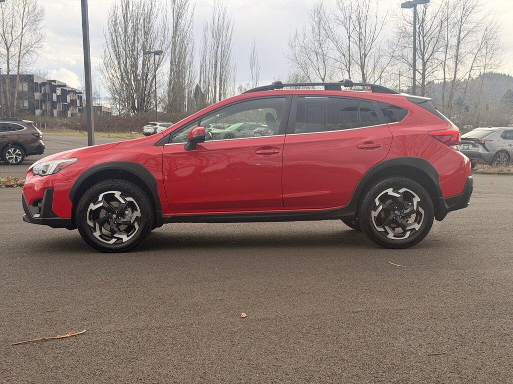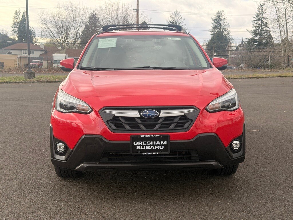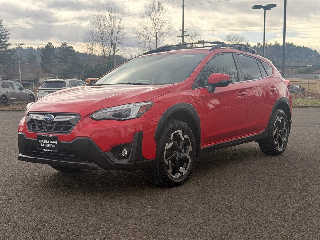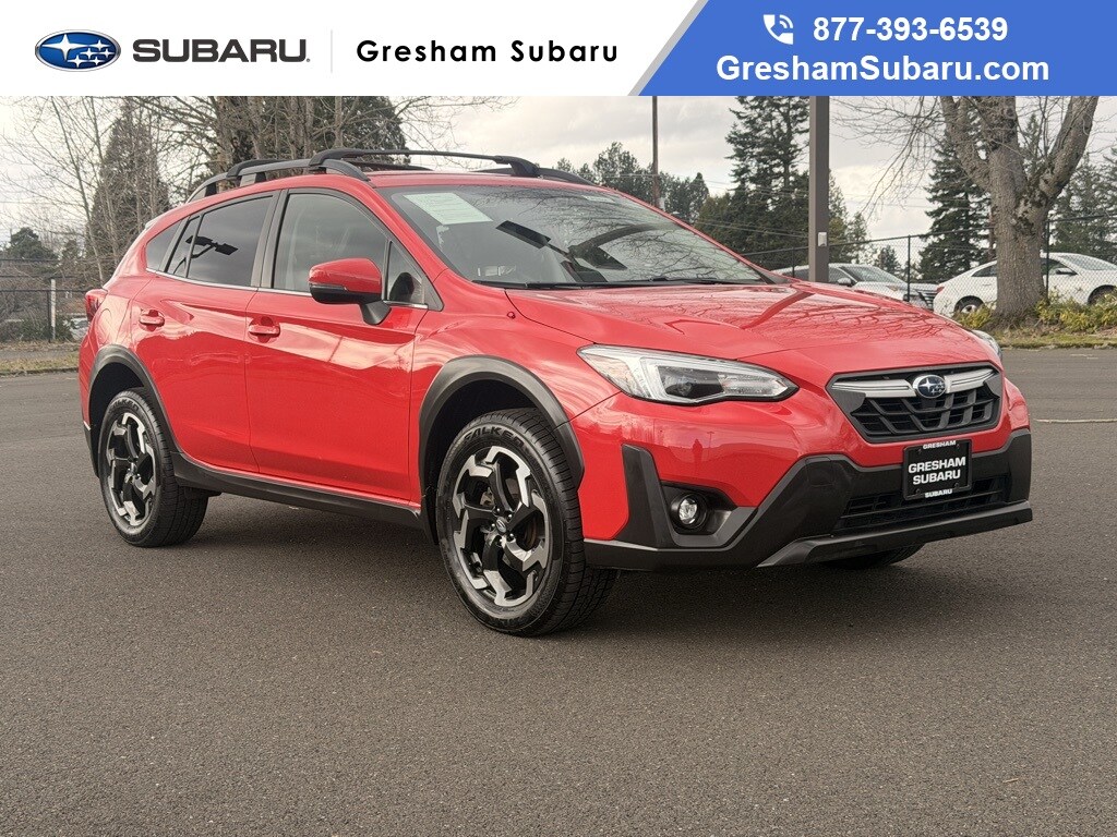 3.70 Axle Ratio, 4-Wheel Disc Brakes, 6 Speakers, ABS brakes, Air Conditioning, Alloy wheels, AM/FM radio: SiriusXM, Anti-whiplash front head restraints, Auto High-beam Headlights, Automatic temperature control, Brake assist, Bumpers: body-color, CD player, Driver door bin, Driver vanity mirror, Dual front impact airbags, Dual front side impact airbags, Electronic Stability Control, Emergency communication system: STARLINK Safety and Security (Subscription Required), Exterior Parking Camera Rear, Four wheel independent suspension, Front anti-roll bar, Front Bucket Seats, Front Center Armrest, Front fog lights, Front reading lights, Fully automatic headlights, Heated door mirrors, Heated Front Bucket Seats, Heated front seats, Illuminated entry, Knee airbag, Leather-Trimmed Upholstery, Low tire pressure warning, Occupant sensing airbag, Outside temperature display, Overhead airbag, Overhead console, Panic alarm, Passenger door bin, Passenger vanity mirror, Power door mirrors, Power driver seat, Power steering, Power windows, Radio data system, Radio: Subaru STARLINK 8.0" Multimedia Plus System, Rear anti-roll bar, Rear seat center armrest, Rear window defroster, Rear window wiper, Remote keyless entry, Security system, Speed control, Speed-sensing steering, Split folding rear seat, Spoiler, STARLINK/Apple CarPlay/Android Auto, Steering wheel mounted audio controls, Subaru STARLINK Smartphone Integration, Tachometer, Telescoping steering wheel, Tilt steering wheel, Traction control, Trip computer, Turn signal indicator mirrors, Variably intermittent wipers, Wheels: 18" Alloy Machine Finish. 2021 Subaru Crosstrek Limited 4D Sport Utility 2.5L DOHC Lineartronic CVT AWD Pure Red Subaru Certified Pre-Owned Details: