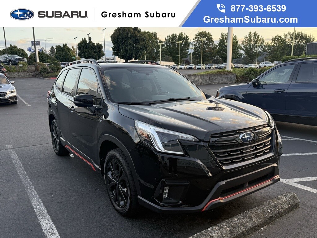 All-Weather Floor Liners, Auto-Dimming Exterior Mirror w/Approach Lighting, Auto-Dimming Mirror w/Compass & HomeLink, harman/kardon 576W Amp & Speaker System, Popular Package #3, Power Rear Gate, Radio: Subaru Starlink 8.0" Multimedia Plus System, Rear Bumper Cover, Rear Seatback Protector, Reverse Automatic Braking System (RAB), 3.70 Axle Ratio, 4-Wheel Disc Brakes, 6 Speakers, ABS brakes, Air Conditioning, Alloy wheels, AM/FM radio: SiriusXM, Anti-whiplash front head restraints, Auto High-beam Headlights, Automatic temperature control, Brake assist, Bumpers: body-color, CD player, Driver door bin, Driver vanity mirror, Dual front impact airbags, Dual front side impact airbags, Electronic Stability Control, Emergency communication system: STARLINK Safety and Security (Subscription Required), Exterior Parking Camera Rear, Four wheel independent suspension, Front anti-roll bar, Front Bucket Seats, Front Center Armrest, Front fog lights, Front reading lights, Fully automatic headlights, Heated door mirrors, Heated Front Bucket Seats, Heated front seats, Illuminated entry, Knee airbag, Leather Shift Knob, Low tire pressure warning, Occupant sensing airbag, Outside temperature display, Overhead airbag, Overhead console, Panic alarm, Passenger door bin, Passenger vanity mirror, Power door mirrors, Power driver seat, Power moonroof: Panoramic, Power steering, Power windows, Radio data system, Radio: Subaru Starlink 6.5" Multimedia Plus System, Rear anti-roll bar, Rear seat center armrest, Rear window defroster, Rear window wiper, Remote keyless entry, Roof rack: rails only, Security system, Speed control, Speed-sensing steering, Split folding rear seat, Spoiler, Sport Cloth Upholstery, STARLINK/Apple CarPlay/Android Auto, Steering wheel mounted audio controls, Tachometer, Telescoping steering wheel, Tilt steering wheel, Traction control, Trip computer, Turn signal indicator mirrors, Variably intermittent wipers, Wheels: 18" x 7.0J Black Finish Aluminum Alloy, 8" Audio w/harman/kardon & RAB & Power Rear Gate, All-Weather Floor Liners, Auto-Dimming Exterior Mirror w/Approach Lighting, Auto-Dimming Mirror w/Compass & HomeLink, harman/kardon 576W Amp & Speaker System, Popular Package #3, Power Rear Gate, Radio: Subaru Starlink 8.0" Multimedia Plus System, Rear Bumper Cover, Rear Seatback Protector, Reverse Automatic Braking System (RAB). 2022 Subaru Forester Sport 4D Sport Utility 2.5L 4-Cylinder DOHC 16V Lineartronic CVT AWD Black Subaru Certified Pre-Owned Details: