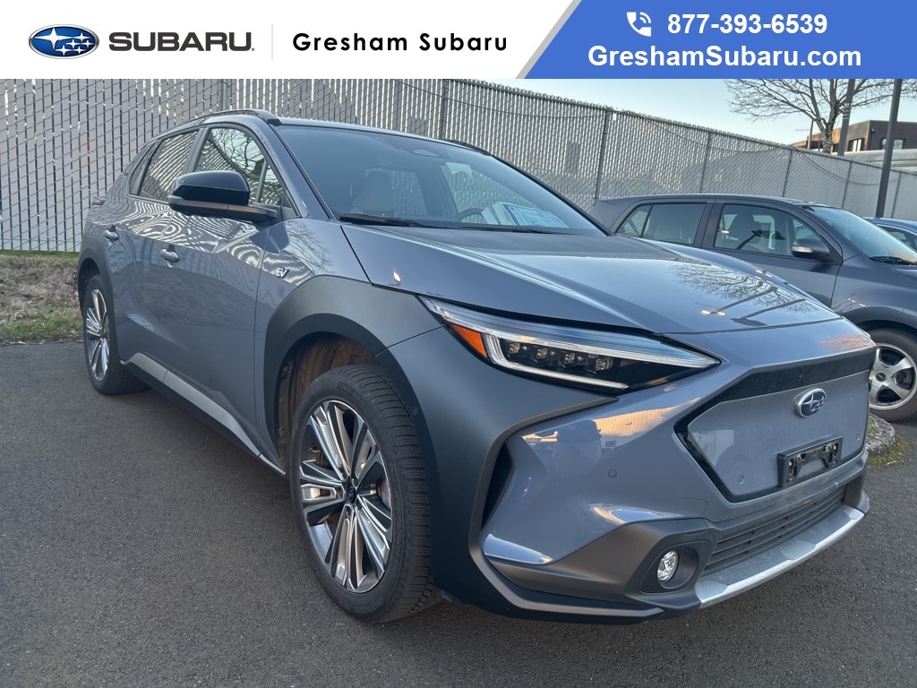 Recent Arrival! CARFAX One-Owner. 4-Wheel Disc Brakes, ABS brakes, Air Conditioning, Alloy wheels, AM/FM radio: SiriusXM, Auto High-beam Headlights, Auto-dimming Rear-View mirror, Automatic temperature control, Brake assist, Bumpers: body-color, Driver door bin, Driver vanity mirror, Dual front impact airbags, Dual front side impact airbags, Electronic Stability Control, Four wheel independent suspension, Front anti-roll bar, Front Bucket Seats, Front Center Armrest, Front dual zone A/C, Front reading lights, Fully automatic headlights, Heated door mirrors, Illuminated entry, Knee airbag, Leather steering wheel, Low tire pressure warning, Occupant sensing airbag, Outside temperature display, Overhead airbag, Overhead console, Panic alarm, Passenger door bin, Passenger vanity mirror, Power door mirrors, Power steering, Power windows, Radio data system, Rear anti-roll bar, Rear seat center armrest, Rear window defroster, Remote keyless entry, Security system, Speed control, Speed-sensing steering, Split folding rear seat, Spoiler, Steering wheel mounted audio controls, Telescoping steering wheel, Tilt steering wheel, Traction control, Trip computer, Variably intermittent wipers. 2023 Subaru Solterra Limited 4D Sport Utility Electric Motor 1-Speed Automatic AWD Gray Pearl Clean CARFAX.