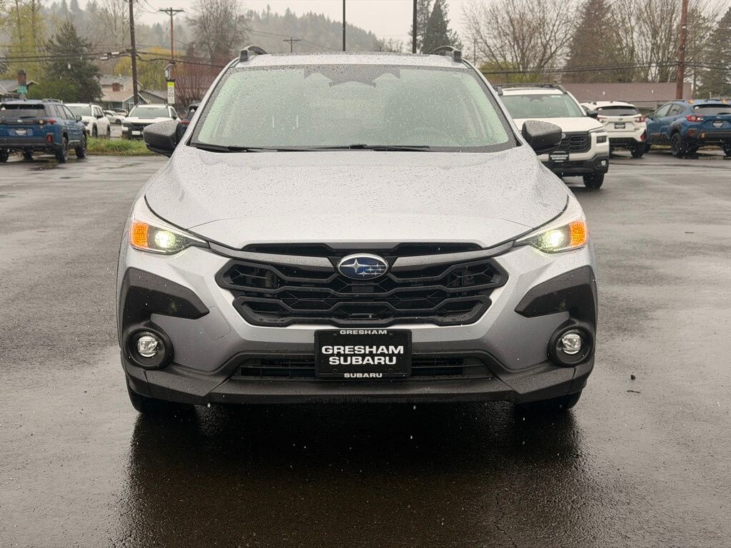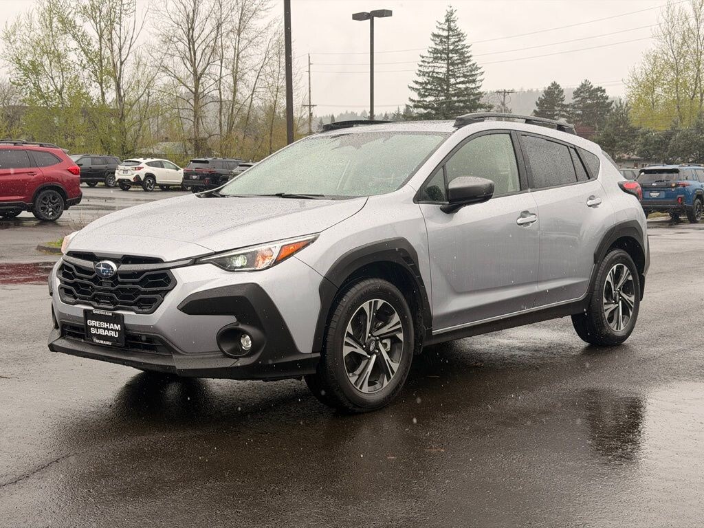 3.90 Axle Ratio, 4-Wheel Disc Brakes, 6 Speakers, ABS brakes, Air Conditioning, Alloy wheels, AM/FM radio: SiriusXM, Anti-whiplash front head restraints, Auto High-beam Headlights, Automatic temperature control, Brake assist, Bumpers: body-color, Driver door bin, Driver vanity mirror, Dual front impact airbags, Dual front side impact airbags, Electronic Stability Control, Emergency communication system: STARLINK Safety and Security (Subscription Required), Exterior Parking Camera Rear, Four wheel independent suspension, Front anti-roll bar, Front Bucket Seats, Front Center Armrest, Front dual zone A/C, Front fog lights, Front reading lights, Fully automatic headlights, Illuminated entry, Knee airbag, Low tire pressure warning, Occupant sensing airbag, Outside temperature display, Overhead airbag, Overhead console, Panic alarm, Passenger door bin, Passenger vanity mirror, Power door mirrors, Power steering, Power windows, Premium Cloth Upholstery, Radio data system, Radio: Subaru STARLINK 11.6" Multimedia Plus Sys, Rear anti-roll bar, Rear seat center armrest, Rear window defroster, Rear window wiper, Remote keyless entry, Security system, Speed control, Speed-sensing steering, Split folding rear seat, Spoiler, STARLINK/Apple CarPlay/Android Auto, Steering wheel mounted audio controls, Tachometer, Telescoping steering wheel, Tilt steering wheel, Traction control, Trip computer, Turn signal indicator mirrors, Variably intermittent wipers, Wheels: 17" x 7.0J Dark Gray Aluminum Alloy. 2024 Subaru Crosstrek Premium 4D Sport Utility 2.0L 4-Cylinder DOHC 16V Lineartronic CVT AWD Ice Silver Metallic Subaru Certified Pre-Owned Details: