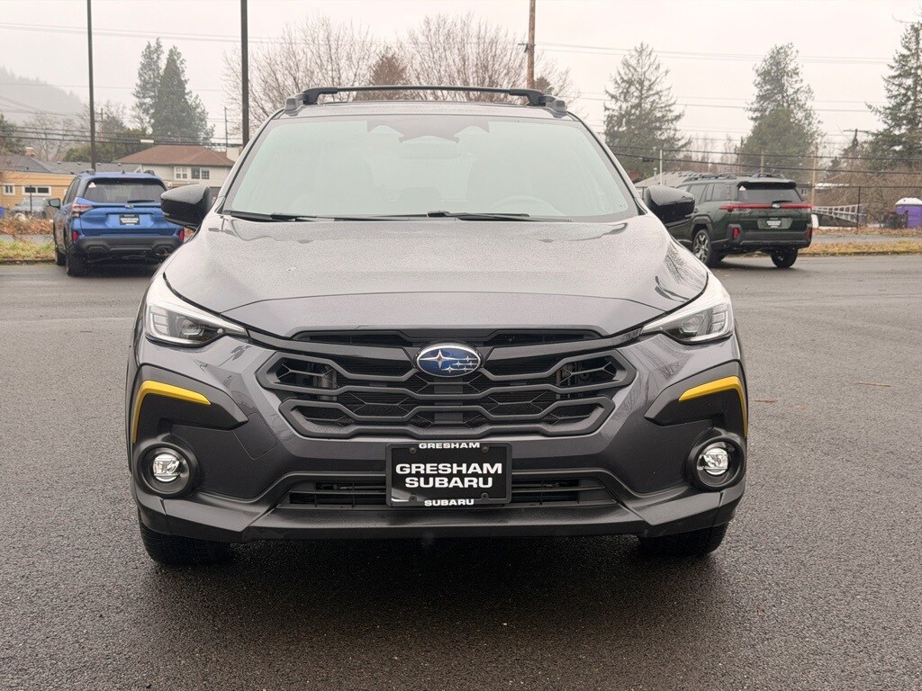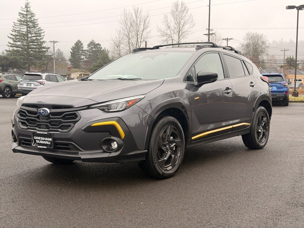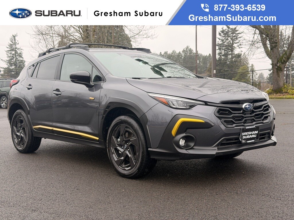 10-Way Power Driver's Seat, All-Weather Floor Liners, Auto-Dimming Exterior Mirror w/Approach Light, Auto-Dimming Mirror w/Compass & HomeLink, Blind Spot Detection (BSD), BSD/RCTA & Power Driver Seat & Power Moonroof, LED Upgrade, Popular Package #3A, Power Moonroof, Rear Bumper Cover, Rear Cross-Traffic Alert (RCTA) System, Rear Seatback Protector, 4-Wheel Disc Brakes, 6 Speakers, ABS brakes, Air Conditioning, Alloy wheels, AM/FM radio: SiriusXM, Anti-whiplash front head restraints, Auto High-beam Headlights, Automatic temperature control, Brake assist, Bumpers: body-color, Driver door bin, Driver vanity mirror, Dual front impact airbags, Dual front side impact airbags, Electronic Stability Control, Emergency communication system, Exterior Parking Camera Rear, Four wheel independent suspension, Front anti-roll bar, Front Bucket Seats, Front Center Armrest, Front dual zone A/C, Front fog lights, Front reading lights, Fully automatic headlights, Heated door mirrors, Heated Front Bucket Seats, Heated front seats, Illuminated entry, Knee airbag, Leather Shift Knob, Leather steering wheel, Low tire pressure warning, Occupant sensing airbag, Outside temperature display, Overhead airbag, Overhead console, Panic alarm, Passenger door bin, Passenger vanity mirror, Power door mirrors, Power steering, Power windows, Radio data system, Radio: Subaru 11.6" Multimedia Plus System, Rear anti-roll bar, Rear seat center armrest, Rear window defroster, Rear window wiper, Remote keyless entry, Security system, Speed control, Speed-sensing steering, Split folding rear seat, Spoiler, Sport Cloth Upholstery, Steering wheel mounted audio controls, Tachometer, Telescoping steering wheel, Tilt steering wheel, Traction control, Trip computer, Turn signal indicator mirrors, Variably intermittent wipers, Wheels: 18" x 7.0" J Dark Gray Aluminum-Alloy, 10-Way Power Driver's Seat, All-Weather Floor Liners, Auto-Dimming Exterior Mirror w/Approach Light, Auto-Dimming Mirror w/Compass & HomeLink, Blind Spot Detection (BSD), BSD/RCTA & Power Driver Seat & Power Moonroof, LED Upgrade, Popular Package #3A, Power Moonroof, Rear Bumper Cover, Rear Cross-Traffic Alert (RCTA) System, Rear Seatback Protector. 2025 Subaru Crosstrek Sport 4D Sport Utility 2.5L 4-Cylinder DOHC 16V Lineartronic CVT AWD Gray Subaru Certified Pre-Owned Details: