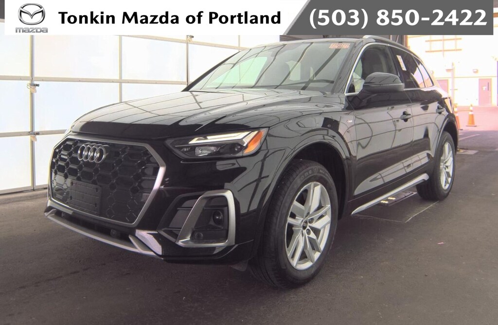 Available Soon. Pending Mechanical Pre-Inspection. Please Call (503) 257-2420 for Details! ! PANORAMIC SUNROOF! CONVENIENCE PACKAGE; HEATED STEERING HWEEL! CARFAX One-Owner. Clean CARFAX. Mythos Black Metallic 2022 Audi Q5 45 S line Premium quattro 4D Sport Utility 2.0L Turbocharged 7-Speed Automatic S tronic quattro Black Leather, 10 Speakers, 4-Wheel Disc Brakes, ABS brakes, Air Conditioning, AM/FM radio, Audi Advanced Key, Auto High-beam Headlights, Auto-Dimming Power Folding Exterior Mirrors, Auto-dimming Rear-View mirror, Automatic temperature control, Back Up Camera, Backup Camera, Blind Spot, BlueTooth, Brake assist, Bumpers: body-color, Compass, Convenience Package, Delay-off headlights, Driver door bin, Driver Seat Memory, Driver vanity mirror, Dual front impact airbags, Dual front side impact airbags, Electronic Stability Control, Emergency communication system: Audi connect CARE, Four wheel independent suspension, Front anti-roll bar, Front Bucket Seats, Front Center Armrest, Front dual zone A/C, Front fog lights, Front reading lights, Garage door transmitter: HomeLink, Genuine wood console insert, Genuine wood dashboard insert, Genuine wood door panel insert, Heated 8-Way Power Front Bucket Seats, Heated door mirrors, Heated front seats, Heated Seats, Heated Steering Wheel, Illuminated entry, Keyless Entry, Leather, Leather Seating Surfaces, Leather Shift Knob, Low tire pressure warning, Occupant sensing airbag, Outside temperature display, Overhead airbag, Overhead console, Panic alarm, Panorama Roof, Passenger vanity mirror, Power door mirrors, Power driver seat, Power Liftgate, Power passenger seat, Power steering, Power windows, Radio data system, Radio: Audi Sound System, Rear air conditioning, Rear anti-roll bar, Rear fog lights, Rear reading lights, Rear seat center armrest, Rear window defroster, Remote keyless entry, Roof rack, Security system, SiriusXM All Access Service, Speed control, Speed-sensing steering, Split folding rear seat, Spoiler, Steering wheel mounted audio controls, Tachometer, Telescoping steering wheel, Tilt steering wheel, Traction control, Trip computer, Turn signal indicator mirrors.