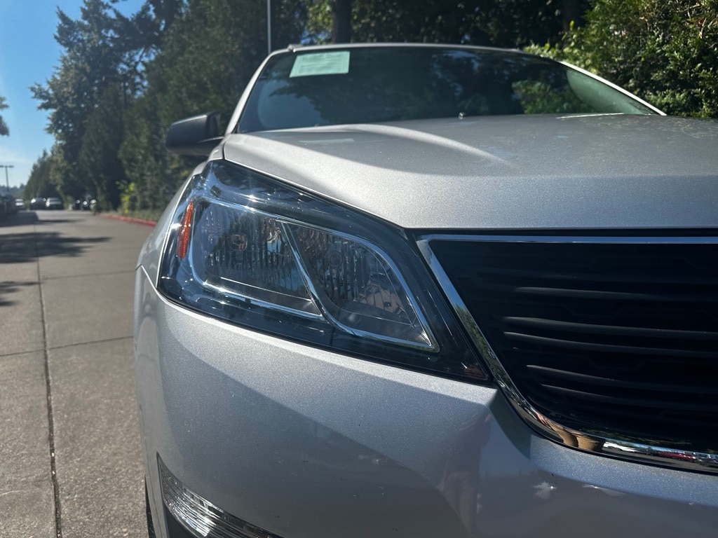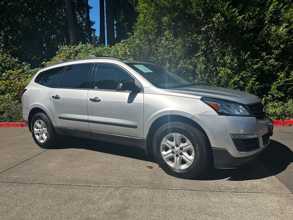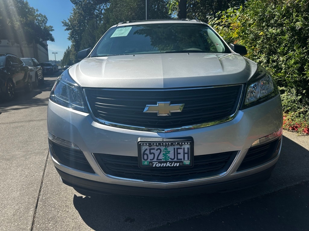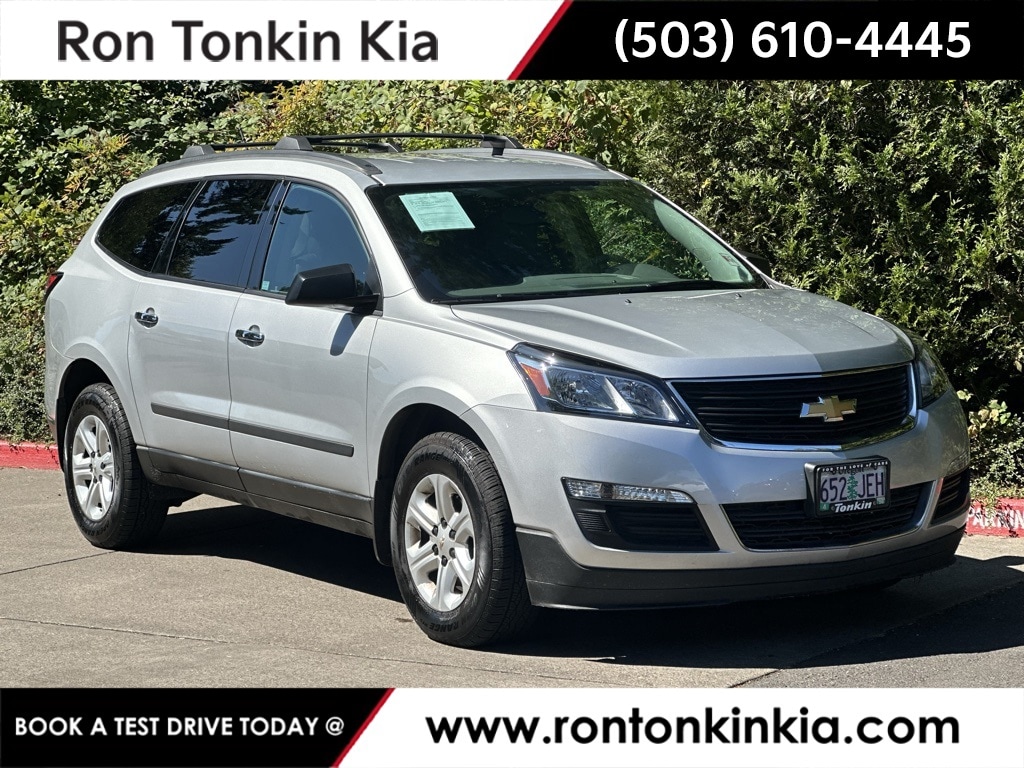 2016 Chevrolet Traverse LS Silver Ice Metallic 3.6L V6 SIDI 17" x 7.5" Steel Wheels, 3.16 Axle Ratio, 3rd row seats: split-bench, 4-Wheel Disc Brakes, 6 Speakers, 8-Passenger Seating (2-3-3 Seating Configuration), ABS brakes, Air Conditioning, Airbags, AM/FM radio: SiriusXM, Bluetooth® For Phone, Bodyside moldings, Brake assist, Bumpers: body-color, CD player, Comfort Grip Urethane Steering Wheel, Compass, Delay-off headlights, Driver door bin, Driver vanity mirror, Dual front impact airbags, Dual front side impact airbags, Electronic Stability Control, Emergency communication system: OnStar, Enhanced Driver Information Center, Exterior Parking Camera Rear, Four wheel independent suspension, Front anti-roll bar, Front Bucket Seats, Front Center Armrest w/Storage, Front reading lights, Fully automatic headlights, Illuminated entry, Low tire pressure warning, Occupant sensing airbag, Outside temperature display, Overhead airbag, Panic alarm, Passenger door bin, Passenger vanity mirror, Power door mirrors, Power steering, Power windows, Premium Cloth Seat Trim, Radio data system, Radio: Color Touch AM/FM/SiriusXM/CD Player, Rear air conditioning, Rear anti-roll bar, Rear reading lights, Rear seat center armrest, Rear window defroster, Rear window wiper, Remote keyless entry, Roof rack: rails only, Security system, SiriusXM Satellite Radio, Speed control, Split folding rear seat, Spoiler, Standard Speaker System, Steering wheel mounted audio controls, Tachometer, Telescoping steering wheel, Tilt steering wheel, Traction control, Trip computer, Variably intermittent wipers, Voltmeter.