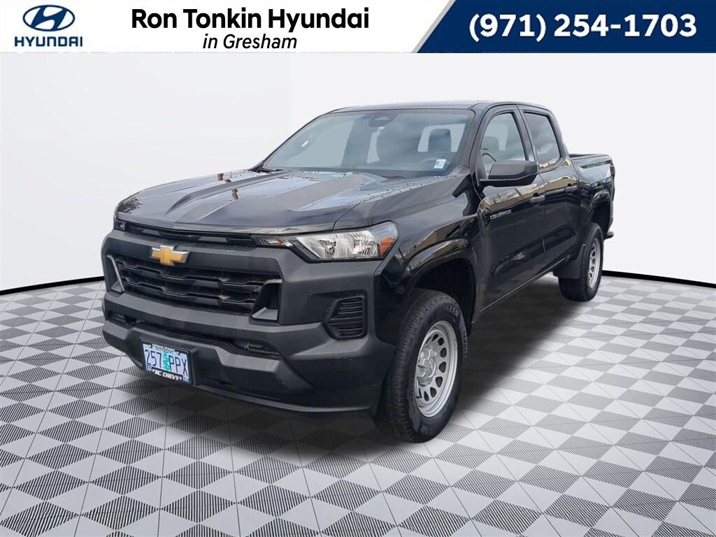 Recent Arrival! 2023 Chevrolet Colorado Work Truck 2.7L Turbo 8-Speed Automatic RWD 4D Crew Cab Black 3.42 Rear Axle Ratio, 4-Way Manual Passenger Seat Adjuster, 4-Wheel Disc Brakes, 6 Speakers, 6-Speaker Audio System Feature, 6-Way Manual Driver Seat Adjuster, ABS brakes, Air Conditioning, AM/FM radio: SiriusXM, Apple CarPlay/Android Auto, Auto High-beam Headlights, Automatic Emergency Braking, Brake assist, Chevy Safety Assist, Cloth Seat Trim, Delay-off headlights, Deleted 3 Years of Remote Access, Driver door bin, Driver vanity mirror, Dual front impact airbags, Dual front side impact airbags, Electronic Stability Control, Following Distance Indicator, Forward Collision Alert, Front anti-roll bar, Front Bucket Seats, Front Center Armrest, Front License Plate Kit, Front Pedestrian & Bicyclist Braking, Front wheel independent suspension, IntelliBeam Automatic High Beam On/Off, Lane Keep Assist w/Lane Departure Warning, Low tire pressure warning, Navigation System, Occupant sensing airbag, Overhead airbag, Panic alarm, Passenger door bin, Passenger vanity mirror, Power door mirrors, Power steering, Power windows, Preferred Equipment Group 2WT, Radio data system, Radio: 11.3" Diagonal Advanced Color LCD Display, Rear step bumper, Remote keyless entry, Security system, SiriusXM Radio, Speed-sensing steering, Split folding rear seat, Steering Wheel Mounted Audio Controls, Steering wheel mounted audio controls, Tachometer, Tilt steering wheel, Traction control, Trip computer, Variably intermittent wipers, Wheels: 17" x 8" Ultra Silver Metallic Steel, Wireless Phone Projection. CARFAX One-Owner. Clean CARFAX. Call for availability. Come in to Ron Tonkin Gresham Hyundai to test drive today! DA2028 View our entire inventory at https://www.rontonkinhyundai.com/