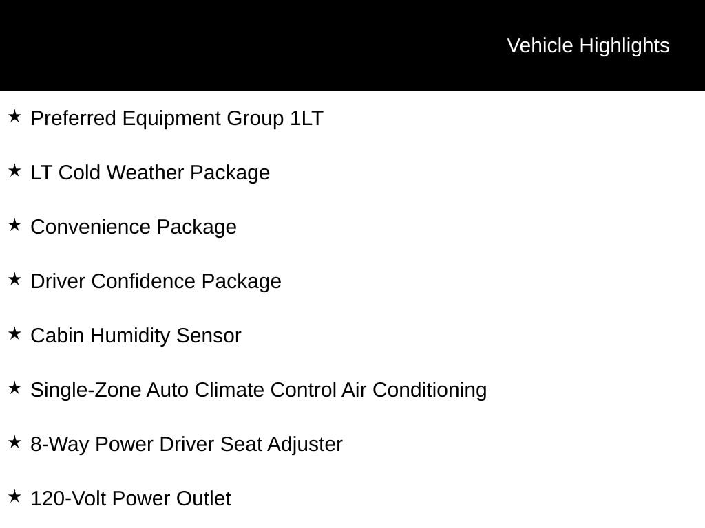 Step inside and you'll be greeted by a host of premium features that cater to your every need. The Convenience Package offers automatic climate control, wireless charging, and a 120-volt power outlet, while the LT Cold Weather Package adds heated seats and a heated steering wheel for those chilly mornings. The Driver Confidence Package provides advanced safety technologies, including Lane Change Alert with Side Blind Zone Alert and Rear Cross Traffic Alert, giving you added peace of mind on the road.