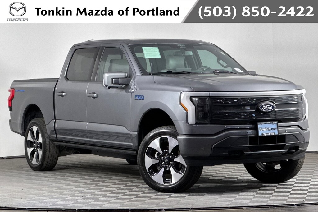 Carbonized Gray Metallic 2024 Ford F-150 Lightning Platinum AWD with Panoramic Roof and BlueCruise 4D Crew Cab Electric Motor Single-Speed Automatic AWD 14 Speakers, 4-Wheel Disc Brakes, ABS brakes, Adjustable pedals, Air Conditioning, Auto High-beam Headlights, Auto tilt-away steering wheel, Auto-dimming door mirrors, Auto-dimming Rear-View mirror, Automatic temperature control, Brake assist, Bumpers: body-color, Compass, Delay-off headlights, Driver door bin, Driver vanity mirror, Dual front impact airbags, Dual front side impact airbags, Electronic Stability Control, Emergency communication system: SYNC 4 911 Assist, Equipment Group 710A Standard, Ford BlueCruise Equipped (3-Years Included), Four wheel independent suspension, Front anti-roll bar, Front Bucket Seats, Front Center Armrest, Front dual zone A/C, Front License Plate Bracket, Front reading lights, Fully automatic headlights, Genuine wood console insert, Genuine wood door panel insert, Heated door mirrors, Heated front seats, Heated rear seats, Heated steering wheel, Illuminated entry, Illuminated running boards, Knee airbag, Low tire pressure warning, Memory seat, Mobile Power Cord (120/240V), Navigation system: Connected Navigation, Occupant sensing airbag, Outside temperature display, Overhead airbag, Overhead console, Panic alarm, Passenger door bin, Passenger vanity mirror, Pedal memory, Power Deployable Running Boards w/Black Accent, Power door mirrors, Power driver seat, Power moonroof, Power passenger seat, Power steering, Power windows, Premium Nirvana Leather Bucket Seats, Radio data system, Radio: B&O Unleashed Sound System by Bang & Olufsen, Rain sensing wipers, Rear anti-roll bar, Rear reading lights, Rear seat center armrest, Rear step bumper, Rear window defroster, Remote keyless entry, Security system, Speed control, Speed-sensing steering, Split folding rear seat, Steering wheel memory, Steering wheel mounted audio controls, SYNC 4A w/Enhanced Voice Recognition, Telescoping steering wheel, Tilt steering wheel, Tough Bed Spray-In Bedliner, Traction control, Trip computer, Turn signal indicator mirrors, Variably intermittent wipers, Ventilated front seats, Wheels: 22" Bright Machined w/Ebony Black.