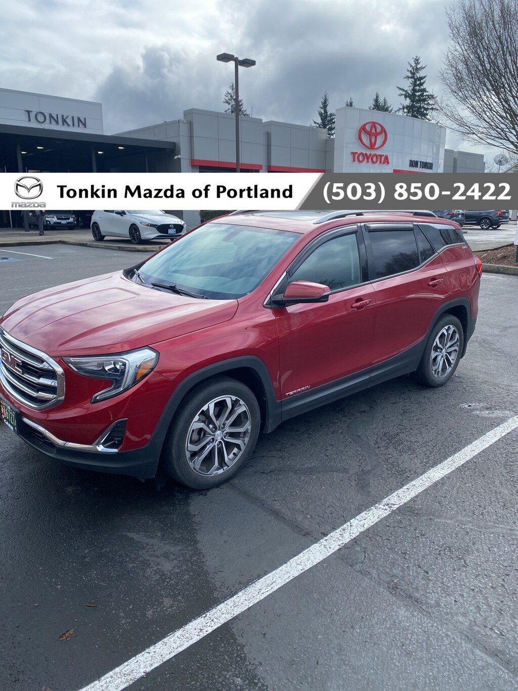 Clean CARFAX. Red Quartz Tintcoat 2019 GMC Terrain SLT 4D Sport Utility 2.0L Turbocharged 9-Speed Automatic AWD AWD, 2 USB Data Ports, 2 USB Data Ports w/SD Card Reader, 4-Wheel Antilock 4-Wheel Disc Brakes, 4-Wheel Disc Brakes, 6 Speakers, 6-Speaker Audio System Feature, 6-Way Power Front Passenger Seat, 8-Way Power Driver Seat Adjuster, ABS brakes, Air Conditioning, AM/FM radio: SiriusXM, Apple CarPlay/Android Auto, Auto-dimming door mirrors, Auto-dimming Rear-View mirror, Automatic temperature control, Back Up Camera, Backup Camera, Blind Spot, BlueTooth, Bluetooth® For Phone, Brake assist, Bumpers: body-color, Compass, Delay-off headlights, Driver Alert Package I, Driver door bin, Driver vanity mirror, Dual Exhaust w/Bright Tips, Dual front impact airbags, Dual front side impact airbags, Electronic Stability Control, Emergency communication system, Four wheel independent suspension, Front anti-roll bar, Front dual zone A/C, Front fog lights, Front Passenger 2-Way Power Lumbar, Front reading lights, Fully automatic headlights, Hands-Free Rear Power Programmable Liftgate, Heated door mirrors, Heated Seats, Heated Steering Wheel, High-Intensity Discharge Headlights, Illuminated entry, Keyless Entry, Lane Change Alert w/Side Blind Zone Alert, Leather, License Plate Front Mounting Package, Low tire pressure warning, Memory Package, Occupant sensing airbag, Outside temperature display, Overhead airbag, Overhead console, Panic alarm, Passenger vanity mirror, Power door mirrors, Power Driver Lumbar Control, Power driver seat, Power steering, Power windows, Preferred Equipment Group 4SA, Preferred Package, Radio data system, Radio: GMC Infotainment Audio System w/8" Display, Rear anti-roll bar, Rear Cross-Traffic Alert, Rear Park Assist, Rear seat center armrest, Rear window defroster, Remote keyless entry, Roof rack: rails only, Safety Alert Seat, Security system, SiriusXM Radio, Skyscape Power Sunroof w/Power Sunscreen, Speed control, Speed-sensing steering, Spoiler, Steering wheel mounted audio controls, Tachometer, Telescoping steering wheel, Tilt steering wheel, Traction control, Trip computer, Turn signal indicator mirrors, Universal Home Remote.