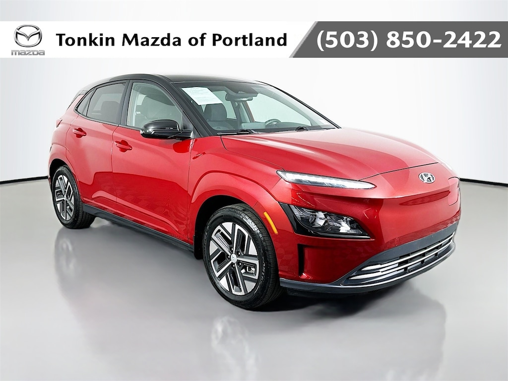 CARFAX One-Owner. Clean CARFAX. Pulse Red w/Black Roof 2022 Hyundai Kona Electric SEL 4D Sport Utility Electric Motor 1-Speed Automatic FWD 4-Wheel Disc Brakes, 6 Speakers, ABS brakes, Air Conditioning, AM/FM radio: SiriusXM, Apple CarPlay & Android Auto, Automatic temperature control, Back Up Camera, Blind Spot, BlueTooth, Brake assist, Bumpers: body-color, Cargo Blocks, Cargo Package, Cargo Tray, Carpeted Floor Mats, Cloth Seat Trim, Delay-off headlights, Driver door bin, Driver vanity mirror, Dual front impact airbags, Dual front side impact airbags, Electronic Stability Control, Emergency communication system: Blue Link Connected Car Service (3-year complimentary subscription), First Aid Kit, Front anti-roll bar, Front Bucket Seats, Front wheel independent suspension, Fully automatic headlights, Heated door mirrors, Illuminated entry, Keyless Entry, Low tire pressure warning, Mudguards (Front & Rear), Occupant sensing airbag, Option Group 01, Outside temperature display, Overhead airbag, Overhead console, Panic alarm, Passenger vanity mirror, Power door mirrors, Power steering, Power windows, Radio: AM/FM/HD Radio/SiriusXM Audio System, Rear seat center armrest, Rear window defroster, Remote keyless entry, Security system, Speed control, Speed-sensing steering, Split folding rear seat, Spoiler, Steering wheel mounted audio controls, Telescoping steering wheel, Tilt steering wheel, Traction control, Trip computer, Turn signal indicator mirrors.