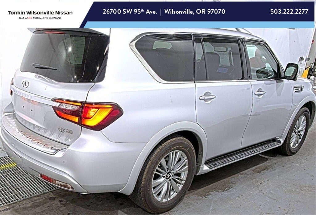 2019 INFINITI QX80 LUXE Liquid Platinum 5.6L V8 13/19 City/Highway MPG 13 Speakers, 2.94 Axle Ratio, 3rd row seats: split-bench, 4-Wheel Disc Brakes, ABS brakes, Air Conditioning, Alloy wheels, AM/FM radio: SiriusXM, Anti-whiplash front head restraints, Auto High-beam Headlights, Auto tilt-away steering wheel, Auto-dimming door mirrors, Auto-dimming Rear-View mirror, Auto-leveling suspension, Automatic temperature control, Brake assist, Bumpers: body-color, CD player, Delay-off headlights, Driver door bin, Driver vanity mirror, Dual front impact airbags, Dual front side impact airbags, DVD-Audio, Electronic Stability Control, Emergency communication system: INFINITI Connection, Four wheel independent suspension, Front anti-roll bar, Front Bucket Seats, Front Center Armrest, Front dual zone A/C, Front fog lights, Front reading lights, Fully automatic headlights, Garage door transmitter: HomeLink, Genuine wood console insert, Genuine wood dashboard insert, Genuine wood door panel insert, Heated door mirrors, Heated Front Bucket Seats, Heated front seats, Heated steering wheel, Illuminated entry, Leather Shift Knob, Leather steering wheel, Leather-Appointed Seats w/Stratford Burl Trim, Literature Kit, Low tire pressure warning, Memory seat, Navigation system: INFINITI InTouch Navigation, Occupant sensing airbag, Outside temperature display, Overhead airbag, Overhead console, Panic alarm, Passenger door bin, Passenger vanity mirror, Power door mirrors, Power driver seat, Power Liftgate, Power moonroof, Power passenger seat, Power steering, Power windows, Radio data system, Radio: AM/FM/HD w/Single In-Dash CD/DVD Player & MP3, Rain sensing wipers, Rear air conditioning, Rear anti-roll bar, Rear audio controls, Rear reading lights, Rear seat center armrest, Rear window defroster, Rear window wiper, Reclining 3rd row seat, Remote keyless entry, Roof rack: rails only, Security system, Speed control, Speed-sensing steering, Split folding rear seat, Spoiler, Steering wheel memory, Steering wheel mounted audio controls, Tachometer, Telescoping steering wheel, Tilt steering wheel, Traction control, Trip computer, Turn signal indicator mirrors, Variably intermittent wipers, Voltmeter, Wheels: 20" x 8.0" Aluminum-Alloy, Wheels: 22" x 8.0" 14-Spoke Forged Aluminum-Alloy. Clean CARFAX. Our Best Price Up Front, No Games or Gimmicks. Our advertised price is for a retail type purchase and may not be available for Fleet or Commercial use type purchase; please call us to confirm.