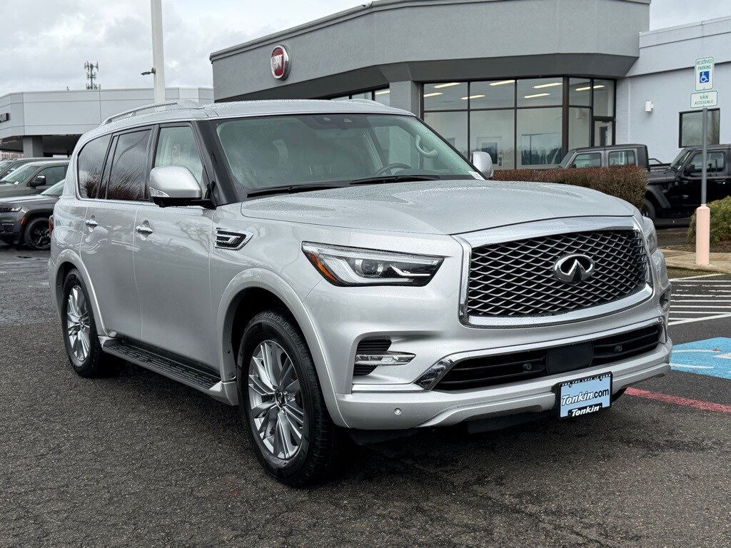 Recent Arrival! Clean CARFAX. 2021 INFINITI QX80 LUXE 5.6L V8 7-Speed Automatic 4WD 4D Sport Utility Liquid Platinum 4WD, Navigation system: INFINITI InTouch Navigation, 13 Speakers, 2.937 Axle Ratio, 3rd row seats: split-bench, 4-Wheel Disc Brakes, ABS brakes, Air Conditioning, AM/FM radio: SiriusXM, Anti-whiplash front head restraints, Apple CarPlay/Android Auto, Auto High-beam Headlights, Auto tilt-away steering wheel, Auto-dimming door mirrors, Auto-dimming Rear-View mirror, Auto-leveling suspension, Automatic temperature control, Brake assist, Bumpers: body-color, CD player, Compass, Custom Fuel Wheels and Off-Road Tires, Delay-off headlights, Driver door bin, Driver vanity mirror, Dual front impact airbags, Dual front side impact airbags, DVD-Audio, Electronic Stability Control, Emergency communication system: INFINITI Connection, Four wheel independent suspension, Front anti-roll bar, Front Bucket Seats, Front Center Armrest, Front dual zone A/C, Front fog lights, Front reading lights, Fully automatic headlights, Garage door transmitter: HomeLink, Heated door mirrors, Heated Front Bucket Seats, Heated front seats, Heated steering wheel, Illuminated entry, Leather Shift Knob, Leather steering wheel, Leather-Appointed Seats, Literature Kit, Low tire pressure warning, Memory seat, Occupant sensing airbag, Outside temperature display, Overhead airbag, Overhead console, Panic alarm, Passenger door bin, Passenger vanity mirror, Power door mirrors, Power driver seat, Power Liftgate, Power moonroof, Power passenger seat, Power steering, Power windows, Radio data system, Radio: Bose Audio System w/13 Speakers, Rain sensing wipers, Rear air conditioning, Rear anti-roll bar, Rear audio controls, Rear reading lights, Rear seat center armrest, Rear window defroster, Rear window wiper, Reclining 3rd row seat, Remote keyless entry, Security system, Speed control, Speed-sensing steering, Split folding rear seat, Spoiler, Steering wheel memory, Steering wheel mounted audio controls, Tachometer, Telescoping steering wheel, Tilt steering wheel, Traction control, Trip computer, Turn signal indicator mirrors, Variably intermittent wipers, Voltmeter, Wheels: 20" x 8.0" Aluminum-Alloy, 4WD, Navigation system: INFINITI InTouch Navigation. ***Call (503) 258-5800 to speak to a Sales Professional*** Come in to Ron Tonkin Chrysler Jeep Dodge Ram Fiat in Milwaukie to test drive today! DL0087.
