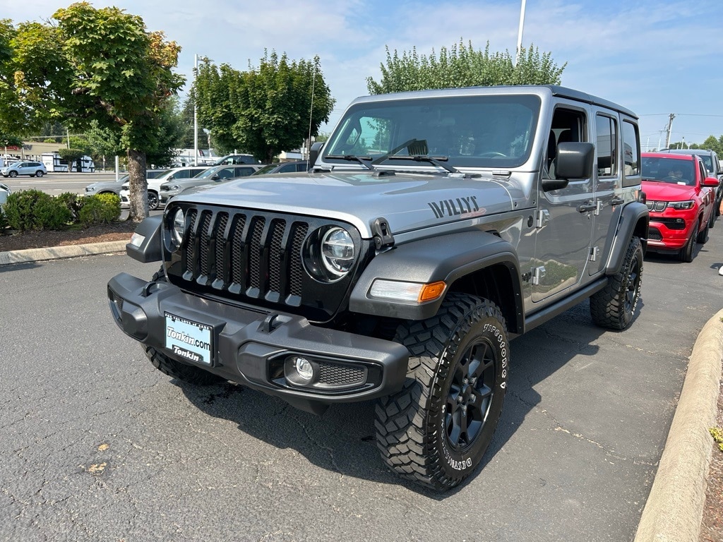 CARFAX One-Owner. Clean CARFAX. 2021 Jeep Wrangler Unlimited Willys 3.0L V6 Turbodiesel 8-Speed Automatic 4WD 4D Sport Utility Billet Silver Metallic Clearcoat 4WD, 4-Wheel Drive Swing Gate Decal, 7.0" Touchscreen Display, Air Conditioning w/Auto Temperature Control, Air Filtering, Anti-Spin Differential Rear Axle, Apple CarPlay, Automatic Headlamps, Black Grille, Black Trail Rated Badge, Cluster 7.0" TFT Color Display, Deep Tint Sunscreen Windows, For More Info, Call 800-643-2112, Front 1-Touch Down Power Windows, Front LED Fog Lamps, Google Android Auto, GPS Antenna Input, Gray EcoDiesel Badge, Integrated Center Stack Radio, Leather Wrapped Steering Wheel, LED Headlamp & Fog Lamp Group, LED Premium Reflector Headlamps, Matte Black Jeep Badge, Mold In Color Bumper w/Gloss Black, MOPAR All-Weather Floor Mats (DISC), Power Heated Mirrors, Quick Order Package 26W Willys (DISC), Radio: Uconnect 4 w/7" Display, Remote Keyless Entry, Security Alarm, SiriusXM Radio Service, SiriusXM Satellite Radio, Speed Sensitive Power Locks, Sun Visors w/Illuminated Vanity Mirrors, Technology Group, USB Host Flip, Wheels: 17" x 7.5" Moab Black Aluminum, Willys, Willys Hood Decal, Wrangler Decal, 3.45 Rear Axle Ratio, 3.73 Rear Axle Ratio, 4-Wheel Disc Brakes, 8 Speakers, ABS brakes, Air Conditioning, AM/FM radio, Aux Battery, Black 3-Piece Hard Top, Brake assist, Cloth Low-Back Bucket Seats, Compass, Delay-off headlights, Driver door bin, Driver vanity mirror, Dual front impact airbags, Dual front side impact airbags, Electronic Stability Control, Freedom Panel Storage Bag, Front anti-roll bar, Front Bucket Seats, Front Center Armrest w/Storage, Front fog lights, Front reading lights, Integrated roll-over protection, Low tire pressure warning, Manufacturer's Statement of Origin, MOPAR Hardtop Headliner, No Soft Top, Non-Lock Fuel Cap w/o Discriminator, Normal Duty Suspension, Occupant sensing airbag, Outside temperature display, ParkView Rear Back-Up Camera, Passenger door bin, Passenger vanity mirror, Power steering, Radio data system, Radio: Uconnect 3 w/5" Display, Rear anti-roll bar, Rear reading lights, Rear Window Defroster, Rear Window Wiper/Washer, Speed control, Split folding rear seat, Steering wheel mounted audio controls, Stop-Start Dual Battery System, Tachometer, Telescoping steering wheel, Tilt steering wheel, Traction control, Trip computer, Variably intermittent wipers, Wheels: 17" x 7.5" Black Steel Styled, 4WD, 4-Wheel Drive Swing Gate Decal, 7.0" Touchscreen Display, Air Conditioning w/Auto Temperature Control, Air Filtering, Anti-Spin Differential Rear Axle, Apple CarPlay, Automatic Headlamps, Black Grille, Black Trail Rated Badge, Cluster 7.0" TFT Color Display, Deep Tint Sunscreen Windows, For More Info, Call 800-643-2112, Front 1-Touch Down Power Windows, Front LED Fog Lamps, Google Android Auto, GPS Antenna Input, Gray EcoDiesel Badge, Integrated Center Stack Radio, Leather Wrapped Steering Wheel, LED Headlamp & Fog Lamp Group, LED Premium Reflector Headlamps, Matte Black Jeep Badge, Mold In Color Bumper w/Gloss Black, MOPAR All-Weather Floor Mats (DISC), Power Heated Mirrors, Quick Order Package 26W Willys (DISC), Radio: Uconnect 4 w/7" Display, Remote Keyless Entry, Security Alarm, SiriusXM Radio Service, SiriusXM Satellite Radio, Speed Sensitive Power Locks, Sun Visors w/Illuminated Vanity Mirrors, Technology Group, USB Host Flip, Wheels: 17" x 7.5" Moab Black Aluminum, Willys, Willys Hood Decal, Wrangler Decal. ***Call (503) 258-5800 to speak to a Sales Professional*** Come in to Ron Tonkin Chrysler Jeep Dodge Ram Fiat in Milwaukie to test drive today! DL0087.
