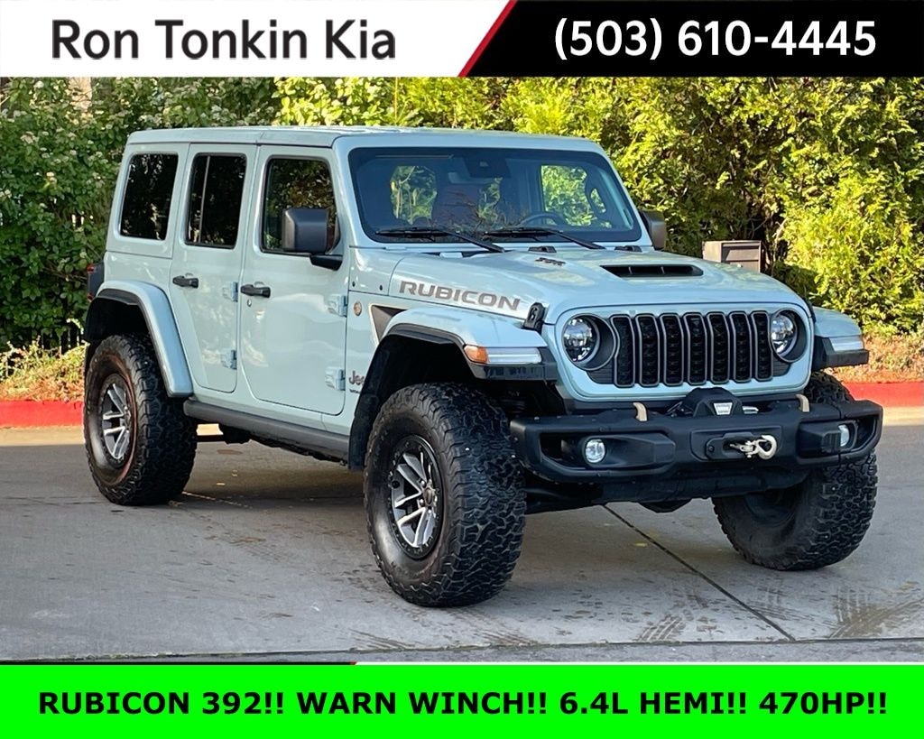2024 Jeep Wrangler Rubicon 392 Earl Clearcoat SRT HEMI 6.4L V8 MDS 35" Tire Rubicon 392 Suspension (DISC), 4-Wheel Disc Brakes, 4.56 Rear Axle Ratio, 9 Speakers, ABS brakes, Air Conditioning, Alloy wheels, AM/FM radio: SiriusXM with 360L, Apple CarPlay/Android Auto, Auto High-beam Headlights, Auto-dimming Rear-View mirror, Automatic temperature control, Brake assist, Compass, Convertible HardTop, Delay-off headlights, Driver door bin, Driver vanity mirror, Dual front impact airbags, Dual front side impact airbags, Electronic Stability Control, Emergency communication system: Jeep Connect, Freedom Panel Storage Bag, Front anti-roll bar, Front Bucket Seats, Front Center Armrest w/Storage, Front dual zone A/C, Front fog lights, Front reading lights, Fully automatic headlights, Garage door transmitter, Glass rear window, Heated door mirrors, Heated front seats, Heated steering wheel, Illuminated entry, Integrated roll-over protection, Leather Shift Knob, Leather steering wheel, Low tire pressure warning, Nappa Leather Seats (DISC), Navigation System, Occupant sensing airbag, Outside temperature display, Overhead airbag, Panic alarm, ParkView Rear Back-Up Camera, Passenger door bin, Passenger vanity mirror, Power door mirrors, Power driver seat, Power passenger seat, Power steering, Power windows, Radio data system, Radio: Uconnect 5 Nav w/12.3" Display, Rear anti-roll bar, Rear reading lights, Rear seat center armrest, Rear Window Defroster, Rear window defroster, Rear window wiper, Rear Window Wiper/Washer, Remote keyless entry, Security system, Speed control, Split folding rear seat, Steering wheel mounted audio controls, Tachometer, Telescoping steering wheel, Tilt steering wheel, Traction control, Trip computer, Variably intermittent wipers, Voltmeter, Wheels: 17" x 8" Mach/Bronze Beadlock Cap (DISC).