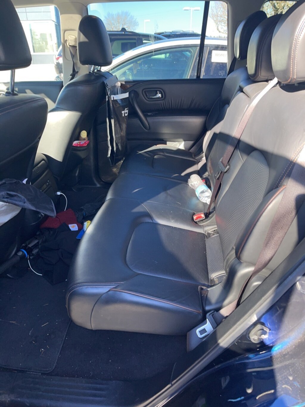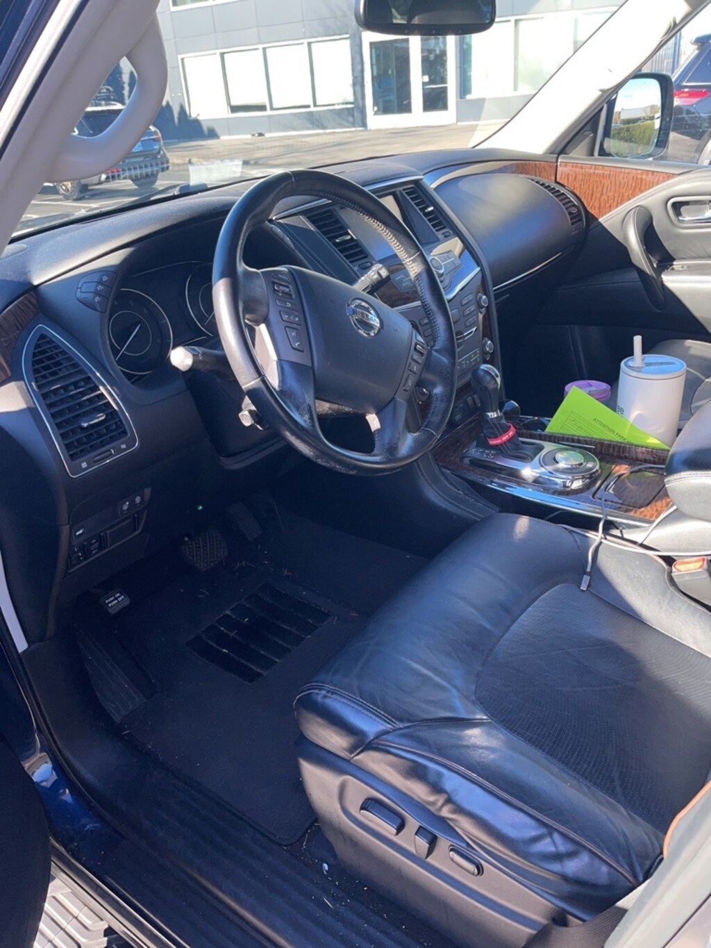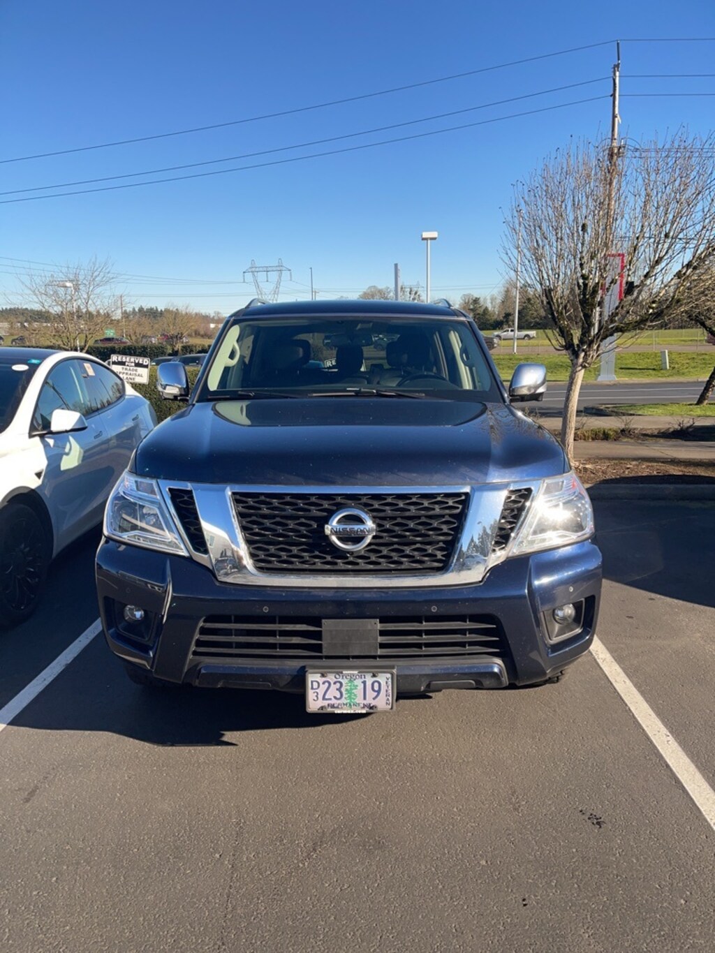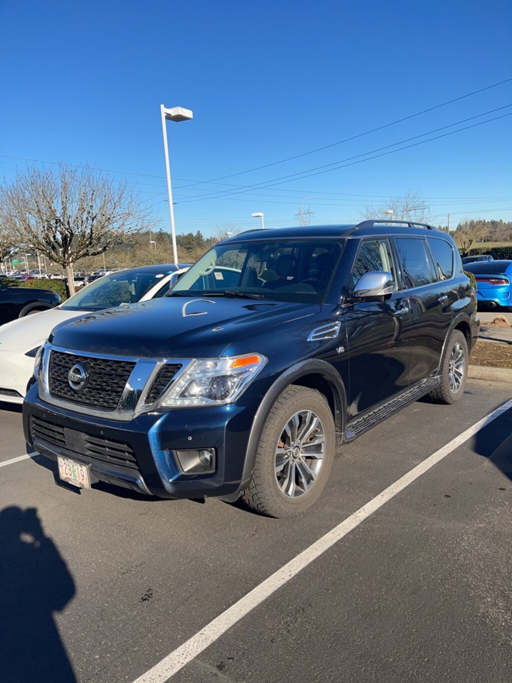 2019 Nissan Armada SL Hermosa Blue Pearl 5.6L V8 DOHC 32V Endurance 14/19 City/Highway MPG 13 Speakers, 2.937 Axle Ratio, 2nd & 3rd Row Carpeted Mats, 3rd row seats: split-bench, 4-Wheel Disc Brakes, ABS brakes, Air Conditioning, Alloy wheels, AM/FM radio: SiriusXM, Anti-whiplash front head restraints, Auto tilt-away steering wheel, Auto-dimming door mirrors, Auto-dimming Rear-View mirror, Auto-leveling suspension, Automatic temperature control, Blind Spot Warning, Brake assist, Bumpers: body-color, CD player, Delay-off headlights, Driver door bin, Driver vanity mirror, Dual front impact airbags, Dual front side impact airbags, Electronic Stability Control, Emergency communication system: NissanConnect Services, Four wheel independent suspension, Front anti-roll bar, Front Bucket Seats, Front Center Armrest, Front dual zone A/C, Front fog lights, Front reading lights, Fully automatic headlights, Garage door transmitter: HomeLink, Heated door mirrors, Heated Front Bucket Seats w/Driver Memory, Heated front seats, Illuminated entry, Intelligent Back-Up Intervention (I-BI), Intelligent Distance Control (I-DC), Leather Shift Knob, Leather-Appointed Seat Trim, Low tire pressure warning, Memory seat, Navigation System, Occupant sensing airbag, Outside temperature display, Overhead airbag, Overhead console, Panic alarm, Passenger door bin, Passenger vanity mirror, Power door mirrors, Power driver seat, Power Liftgate, Power passenger seat, Power Sliding Moonroof w/Front Tilt & Rear Slide, Power steering, Power windows, Premium Package, Radio data system, Radio: AM/FM/SXM/CD/MP3/HD, Rain sensing wipers, Rear air conditioning, Rear anti-roll bar, Rear Cross Traffic Alert (RCTA), Rear reading lights, Rear seat center armrest, Rear window defroster, Rear window wiper, Reclining 3rd row seat, Remote keyless entry, Roof rack: rails only, Security system, Speed control, Speed-sensing steering, Speed-Sensitive Wipers, Split folding rear seat, Spoiler, Steering wheel memory, Steering wheel mounted audio controls, Tachometer, Telescoping steering wheel, Tilt steering wheel, Traction control, Trip computer, Turn signal indicator mirrors, Variably intermittent wipers, Voltmeter, Wheels: 20" Machined Finish Painted Alloy. Our Best Price Up Front, No Games or Gimmicks. Our advertised price is for a retail type purchase and may not be available for Fleet or Commercial use type purchase; please call us to confirm.