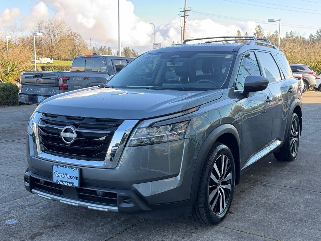 2024 Nissan Pathfinder Platinum Gun Metallic 3.5L V6 DOHC 20/25 City/Highway MPG 4WD, 13 Speakers, 2nd-Row Rear Headrest, 3rd row seats: bench, 4-Wheel Disc Brakes, ABS brakes, Air Conditioning, Alloy wheels, AM/FM radio: SiriusXM, Auto High-beam Headlights, Auto tilt-away steering wheel, Auto-dimming Rear-View mirror, Automatic temperature control, Axle Ratio: 4.334, Black Splash Guards (Set of 4), Bodyside moldings, Bose Premium Audio System, Brake assist, Bumpers: body-color, Captain's Chairs Carpeted Floor Mats (Set of 4), Cargo Area Protector, Cargo Package, Cross Bars, Delay-off headlights, Driver door bin, Driver vanity mirror, Dual front impact airbags, Dual front side impact airbags, Electronic Stability Control, Emergency communication system, Exterior Parking Camera Rear, Four wheel independent suspension, Front anti-roll bar, Front Bucket Seats, Front Center Armrest, Front dual zone A/C, Front reading lights, Fully automatic headlights, Garage door transmitter: HomeLink, Heads-Up Display, Heated & Cooled Front Bucket Seats, Heated door mirrors, Heated front seats, Heated rear seats, Heated steering wheel, Illuminated entry, Knee airbag, Leather steering wheel, Low tire pressure warning, Memory seat, Navigation system: NissanConnect with Navigation and Services, NissanConnect featuring Apple CarPlay and Android Auto, NissanConnect w/Navigation & Services, Occupant sensing airbag, Outside temperature display, Overhead airbag, Overhead console, Panic alarm, Passenger door bin, Passenger vanity mirror, Platinum Captain Chairs Package, Power door mirrors, Power driver seat, Power Liftgate, Power moonroof, Power passenger seat, Power steering, Power windows, Radio data system, Radio: AM/FM Audio System, Rain sensing wipers, Rear air conditioning, Rear anti-roll bar, Rear reading lights, Rear seat center armrest, Rear side impact airbag, Rear window defroster, Rear window wiper, Reclining 3rd row seat, Remote keyless entry, Security system, Semi-Aniline Leather-Appointed Seating Surfaces, Speed control, Speed-sensing steering, Speed-Sensitive Wipers, Split folding rear seat, Spoiler, Steering wheel memory, Steering wheel mounted audio controls, Tachometer, Telescoping steering wheel, Tilt steering wheel, Traction control, Trip computer, Turn signal indicator mirrors, Variably intermittent wipers, Ventilated front seats, Wheels: 20" x 8J Machined Alloy, 4WD. CARFAX One-Owner. Clean CARFAX. Our Best Price Up Front, No Games or Gimmicks. Our advertised price is for a retail type purchase and may not be available for Fleet or Commercial use type purchase; please call us to confirm.