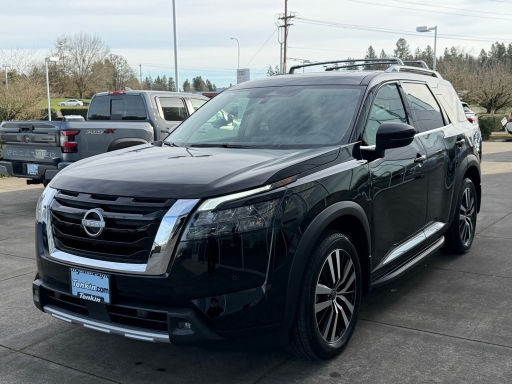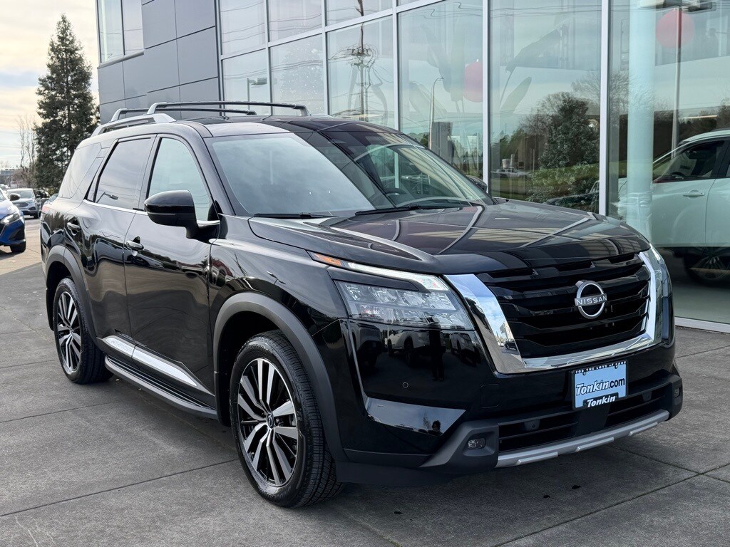 2025 Nissan Pathfinder Platinum Super Black 3.5L V6 DOHC 20/25 City/Highway MPG 4WD, 13 Speakers, 3rd row seats: bench, 4-Wheel Disc Brakes, ABS brakes, Air Conditioning, Alloy wheels, AM/FM radio: SiriusXM, Auto High-beam Headlights, Auto tilt-away steering wheel, Auto-dimming Rear-View mirror, Automatic temperature control, Bench Seat Carpeted Floor Mats (set of 4), Black Splash Guards (set of 4), Bodyside moldings, Bose Premium Audio System, Brake assist, Bumpers: body-color, Cargo Area Protector, Cargo Net, Cargo Package, Climate Controlled Front Bucket Seats, Cross Bars, Delay-off headlights, Driver door bin, Driver vanity mirror, Dual front impact airbags, Dual front side impact airbags, Electronic Stability Control, Emergency communication system, Exterior Parking Camera Rear, First Aid, Four wheel independent suspension, Front anti-roll bar, Front Bucket Seats, Front Center Armrest, Front dual zone A/C, Front reading lights, Fully automatic headlights, Garage door transmitter: HomeLink, Heads-Up Display, Heated door mirrors, Heated front seats, Heated rear seats, Heated steering wheel, Illuminated entry, Knee airbag, Leather steering wheel, LED Fog Lamps, Low tire pressure warning, Memory seat, Navigation system: NissanConnect with Navigation and Services, Nissan USB Charging Cable Set, NissanConnect featuring Apple CarPlay and Android Auto, NissanConnect with Navigation and Services, Occupant sensing airbag, Outside temperature display, Overhead airbag, Overhead console, Panic alarm, Passenger door bin, Passenger vanity mirror, Power door mirrors, Power driver seat, Power Liftgate, Power moonroof, Power passenger seat, Power steering, Power windows, Radio data system, Radio: AM/FM Audio System, Rain sensing wipers, Rear air conditioning, Rear anti-roll bar, Rear reading lights, Rear seat center armrest, Rear side impact airbag, Rear window defroster, Rear window wiper, Reclining 3rd row seat, Remote keyless entry, Running Boards, Security system, Semi-Aniline Leather-Appointed Seating Surfaces, Speed control, Speed-sensing steering, Speed-Sensitive Wipers, Split folding rear seat, Spoiler, Steering wheel memory, Steering wheel mounted audio controls, Tachometer, Telescoping steering wheel, Tilt steering wheel, Traction control, Trip computer, Turn signal indicator mirrors, Variably intermittent wipers, Ventilated front seats, Wheels: 20" x 8J Machined Alloy, 4WD. CARFAX One-Owner. Clean CARFAX. Priced below KBB Fair Purchase Price! Odometer is 3398 miles below market average! Our Best Price Up Front, No Games or Gimmicks. Our advertised price is for a retail type purchase and may not be available for Fleet or Commercial use type purchase; please call us to confirm.