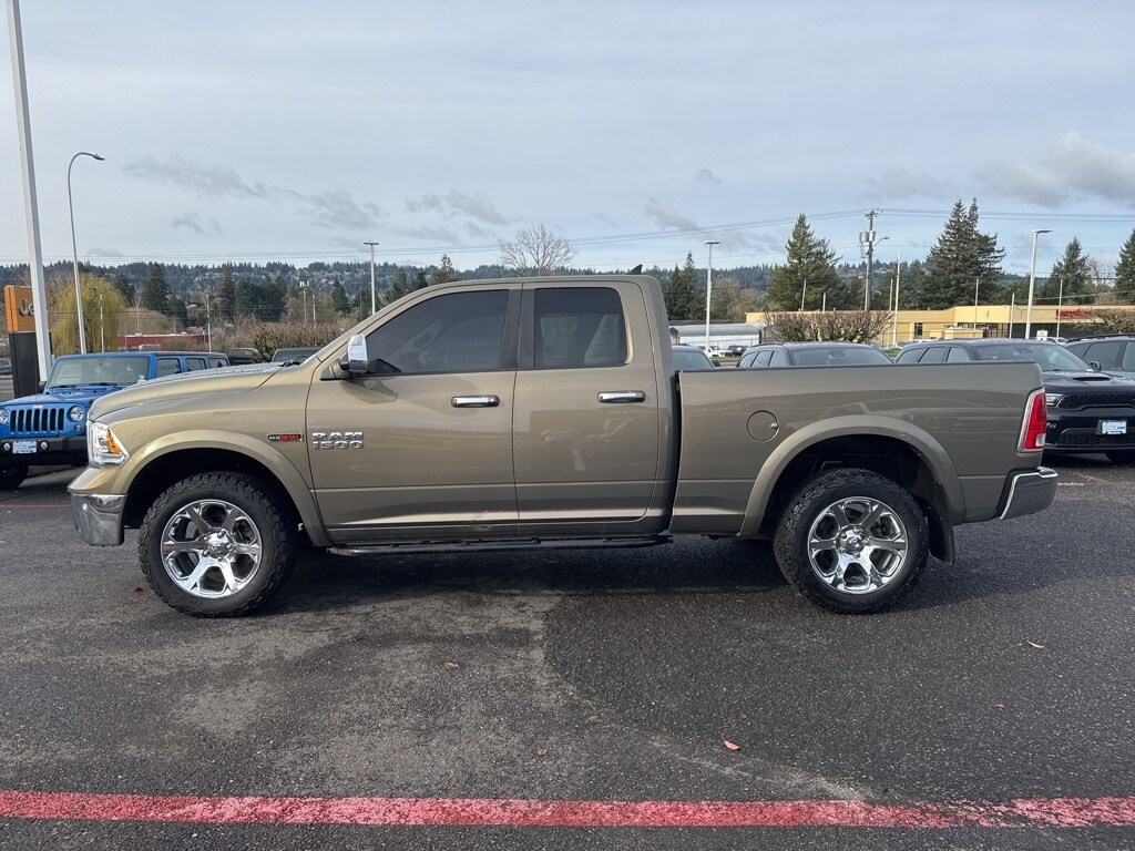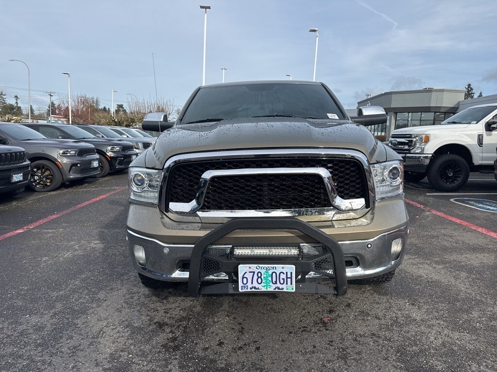 Clean CARFAX. 2014 Ram 1500 Laramie EcoDiesel 3.0L V6 8-Speed Automatic 4WD 4D Quad Cab Prairie Pearlcoat 4WD, Power Chrome Trailer Tow Mirrors, Protection Group, Quick Order Package 28H Laramie, Tow Hooks, Trailer Brake Control, Trailer Tow Mirrors & Brake Group, 10 Speakers, 115V Auxiliary Power Outlet, 20" x 9" Chrome Clad Aluminum Wheels, 4-Wheel Disc Brakes, ABS brakes, Active Grille Shutters, Adjustable pedals, Air Conditioning, AM/FM radio, Anti-Spin Differential Rear Axle, Audio memory, Auto-dimming door mirrors, Auto-dimming Rear-View mirror, Automatic temperature control, Brake assist, Bumpers: chrome, Compass, Custom Fuel Wheels and Off-Road Tires, Delay-off headlights, Driver door bin, Driver vanity mirror, Dual front impact airbags, Dual front side impact airbags, Electronic Shift, Electronic Stability Control, Emergency communication system, Engine Block Heater, Folding Flat Load Floor Storage, Front anti-roll bar, Front Center Armrest w/Storage, Front dual zone A/C, Front fog lights, Front reading lights, Front wheel independent suspension, Fully automatic headlights, Garage door transmitter, Heated door mirrors, Heated Front Seats, Heated front seats, Heated steering wheel, High Back Seats, Illuminated entry, Leather steering wheel, Leather Trim 40/20/40 Bench Seat, Low tire pressure warning, Memory seat, Occupant sensing airbag, Outside temperature display, Overhead airbag, Overhead console, Panic alarm, ParkSense Front/Rear Park Assist System, ParkView Rear Back-Up Camera, Passenger door bin, Passenger vanity mirror, Pedal memory, Power 10-Way Memory Driver & 6-Way Passenger Seats, Power door mirrors, Power driver seat, Power passenger seat, Power steering, Power windows, Radio data system, Radio: Uconnect 8.4A AM/FM/SXM/BT, Rear 60/40 Split Folding Seat, Rear anti-roll bar, Rear step bumper, Remote keyless entry, Remote Start System, Security system, Single Disc Remote CD Player, Speed control, Split folding rear seat, Spray In Bedliner, Steering wheel mounted audio controls, Tachometer, Tilt steering wheel, Tip Start, Traction control, Trip computer, Turn signal indicator mirrors, Variably intermittent wipers, Ventilated Front Seats, Ventilated front seats, Voltmeter, 4WD, Power Chrome Trailer Tow Mirrors, Protection Group, Quick Order Package 28H Laramie, Tow Hooks, Trailer Brake Control, Trailer Tow Mirrors & Brake Group. ***Call (503) 258-5800 to speak to a Sales Professional*** Come in to Ron Tonkin Chrysler Jeep Dodge Ram Fiat in Milwaukie to test drive today! DL0087.