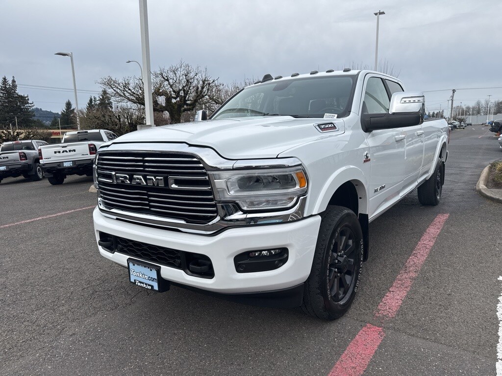 Recent Arrival! Clean CARFAX. 2024 Ram 3500 Laramie Cummins 6.7L I6 Turbodiesel 6-Speed Automatic 4WD 4D Crew Cab Bright White Clearcoat 4WD, 12" Touchscreen Display, 18" x 8" Polished Aluminum Wheels, 2nd Row In Floor Storage Bins, 4G LTE Wi-Fi Hot Spot, Alexa Built-In, Apple CarPlay, Auto Adjust In Reverse Exterior Mirrors, Auto Dimming Exterior Passenger Mirror, Auto High Beam Headlamp Control, Auto Power-Folding Mirrors, Auto-Dimming Exterior Mirrors, Auxiliary Switches Prep, Bed Utility Group, Blind Spot & Cross Path Detection, Center Hub, Chrome Exterior Mirrors, Clearance Lamps, Cold Weather Group, Connected Travel & Traffic Services, Connectivity - US/Canada, Dash Pass Thru Wire Circuits, Disassociated Touchscreen Display, Engine Block Heater, Exterior Mirrors Courtesy Lamps, Exterior Mirrors w/Heating Element, Exterior Mirrors w/Memory, Exterior Mirrors w/Supplemental Signals, Foam Bottle Insert (Door Trim Panel), For Details Visit DriveUconnect.com, For More Info, Call 800-643-2112, Forward & Reverse Utility Lights, Front LED Fog Lamps, Global Telematics Box Module (TBM), Google Android Auto, GPS Antenna Input, GPS Navigation, HD Radio, I/P Mounted Auxiliary Switches, Integrated Voice Command w/Bluetooth, Laramie Level 1 Equipment Group, LED Bed Lighting, LED Reflector Headlamps, LED Tail Lamps, Mirror Running Lights, MOPAR Deployable Bed Step, MOPAR Spray In Bedliner, MOPAR Winter Front Grille Cover, Off-Road Information Pages, ParkSense Front/Rear Park Assist System, Power Adjust Mirrors, Power Adjustable Pedals w/Memory, Power Heat Fold Memory Telescopic Mirrors, Power Telescoping Mirrors, Power-Adjustable Convex Aux Mirrors, Protection Group, Quick Order Package 2HH Laramie, Radio: Uconnect 5 Nav w/12.0" Display, Rain Sensitive Windshield Wipers, Rear Power Sliding Window, Rear Window Defroster, Remote Tailgate Release, Selectable Tire Fill Alert, SiriusXM Radio Service, SiriusXM w/360L, Snow Chief Group, Trailer Tow Pages, 10 Speakers, 115V Auxiliary Rear Power Outlet, 2 Way Rear Headrest Seat, 220 Amp Alternator, 3.73 Axle Ratio, 4 Way Front Headrests, 4-Wheel Disc Brakes, 50 Gallon Fuel Tank, 5th Wheel/Gooseneck Towing Prep Group, 8.4" Touchscreen Display, ABS brakes, Active Noise Control System, Adaptive Steering System, Air Conditioning, AM/FM radio: SiriusXM with 360L, Apple CarPlay/Android Auto, Auto-dimming Rear-View mirror, Automatic temperature control, Brake assist, Bumpers: body-color, Compass, CTR Stop Lamp w/Cargo View Camera, Custom Fuel Wheels and Off-Road Tires, Delay-off headlights, Driver door bin, Driver vanity mirror, Dual Alternators Rated At 440 Amps, Dual front impact airbags, Dual front side impact airbags, Electronic Stability Control, Electronically Controlled Throttle, Folding Flat Load Floor Storage, Front anti-roll bar, Front Center Armrest w/Storage, Front dual zone A/C, Front License Plate Bracket, Front reading lights, Front Seat Back Map Pockets, Fully automatic headlights, Garage door transmitter, Heated door mirrors, Heated Front Seats, Heated front seats, Heated Steering Wheel, Heated steering wheel, High Back Seats, Illuminated entry, Integrated Center Stack Radio, Leather steering wheel, Leather Trim 40/20/40 Bench Seat, Low tire pressure warning, MOPAR Front & Rear Rubber Floor Mats, Navigation System, Occupant sensing airbag, Outside temperature display, Overhead airbag, Overhead console, Panic alarm, ParkView Rear Back-Up Camera, Passenger door bin, Passenger vanity mirror, Power 8-Way Adjustable Passenger Seat, Power Adjust 8-Way Driver Seat, Power door mirrors, Power driver seat, Power passenger seat, Power steering, Power windows, Radio data system, Radio: Uconnect 5 Nav w/8.4" Display, Rear 60/40 Folding Seat, Rear reading lights, Rear seat center armrest, Rear step bumper, Remote keyless entry, Security system, Speed control, Split folding rear seat, Steering wheel mounted audio controls, Tachometer, Tilt steering wheel, Tip Start, Traction control, Trip computer, Tu