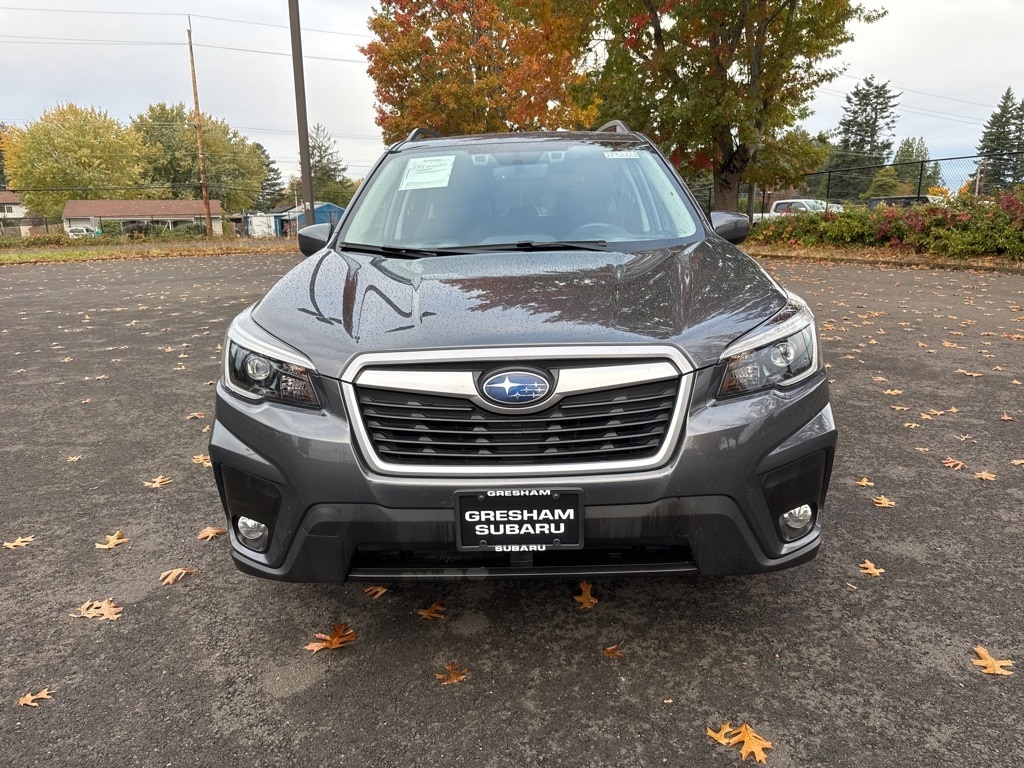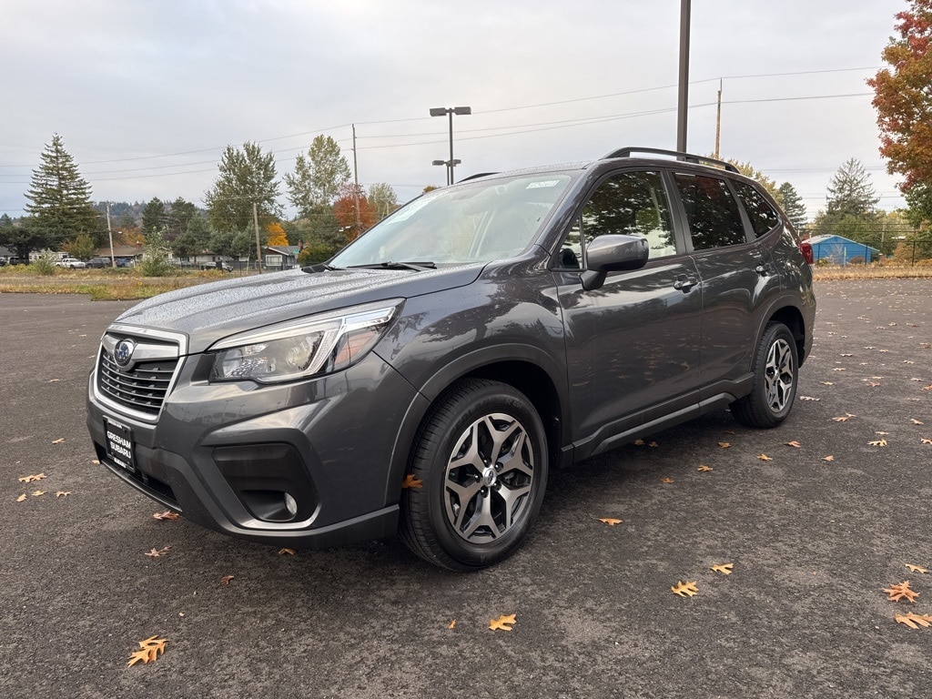 3.70 Axle Ratio, 4-Wheel Disc Brakes, 6 Speakers, ABS brakes, Air Conditioning, Alloy wheels, AM/FM radio: SiriusXM, Auto High-beam Headlights, Automatic temperature control, Brake assist, Bumpers: body-color, CD player, Cloth Upholstery, Driver door bin, Driver vanity mirror, Dual front impact airbags, Dual front side impact airbags, Electronic Stability Control, Emergency communication system: STARLINK Safety and Security (Subscription Required), Exterior Parking Camera Rear, Four wheel independent suspension, Front anti-roll bar, Front Bucket Seats, Front Center Armrest, Front fog lights, Front reading lights, Fully automatic headlights, Heated door mirrors, Heated Front Bucket Seats, Heated front seats, Illuminated entry, Knee airbag, Low tire pressure warning, Occupant sensing airbag, Outside temperature display, Overhead airbag, Overhead console, Panic alarm, Passenger door bin, Passenger vanity mirror, Power door mirrors, Power driver seat, Power moonroof: Panoramic, Power steering, Power windows, Radio data system, Radio: Subaru Starlink 6.5" Multimedia Plus System, Rear anti-roll bar, Rear seat center armrest, Rear window defroster, Rear window wiper, Remote keyless entry, Roof rack: rails only, Security system, Speed control, Speed-sensing steering, Split folding rear seat, Spoiler, STARLINK/Apple CarPlay/Android Auto, Steering wheel mounted audio controls, Tachometer, Telescoping steering wheel, Tilt steering wheel, Traction control, Trip computer, Variably intermittent wipers, Wheels: 17" x 7.0J Black Machine Finish Alloy. 2021 Subaru Forester Premium 4D Sport Utility 2.5L 4-Cylinder DOHC 16V VVT Lineartronic CVT AWD Gray Metallic Subaru Certified Pre-Owned Details: