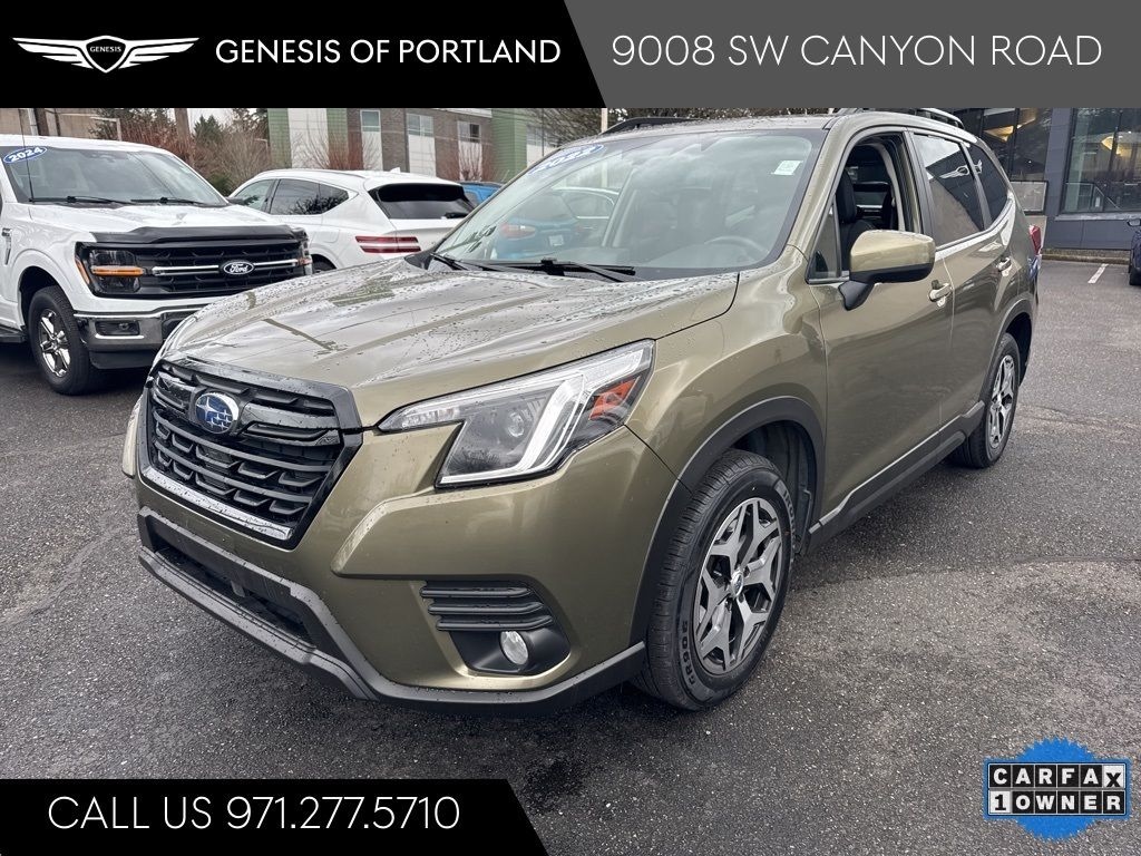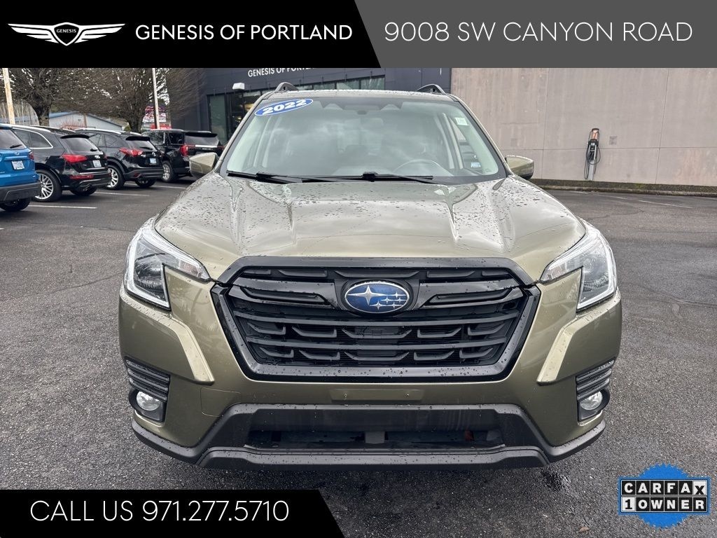 2022 Subaru Forester Premium 4D Sport Utility 2.5L 4-Cylinder DOHC 16V Lineartronic CVT AWD Autumn Green Metallic CARFAX One-Owner. 3.70 Axle Ratio, 4-Wheel Disc Brakes, 6 Speakers, ABS brakes, Air Conditioning, Alloy wheels, AM/FM radio: SiriusXM, Anti-whiplash front head restraints, Auto High-beam Headlights, Automatic temperature control, Blind Spot Detection (BSD), Blind Spot Detection w/RCTA & Power Rear Gate, Brake assist, Bumpers: body-color, CD player, Driver door bin, Driver vanity mirror, Driver's Seatback Divided Pocket, Dual front impact airbags, Dual front side impact airbags, Dual USB Charge Ports, Electronic Stability Control, Emergency communication system: STARLINK Safety and Security (Subscription Required), Exterior Parking Camera Rear, EyeSight System, Four wheel independent suspension, Front anti-roll bar, Front Bucket Seats, Front Center Armrest, Front fog lights, Front reading lights, Fully automatic headlights, Heated door mirrors, Heated Front Bucket Seats, Heated front seats, Illuminated entry, Knee airbag, Low tire pressure warning, Multi-Function High Grade Display, Occupant sensing airbag, Outside temperature display, Overhead airbag, Overhead console, Panic alarm, Passenger door bin, Passenger vanity mirror, Power door mirrors, Power driver seat, Power moonroof: Panoramic, Power Rear Gate, Power steering, Power windows, Premium Cloth Upholstery, Radio data system, Radio: Subaru Starlink 6.5" Multimedia Plus System, Rear anti-roll bar, Rear seat center armrest, Rear window defroster, Rear window wiper, Remote keyless entry, Roof rack: rails only, Security system, Speed control, Speed-sensing steering, Split folding rear seat, Spoiler, STARLINK/Apple CarPlay/Android Auto, Steering wheel mounted audio controls, Tachometer, Telescoping steering wheel, Tilt steering wheel, Traction control, Trip computer, Variably intermittent wipers, Wheels: 17" x 7.0J Black Machine Finish Alloy.