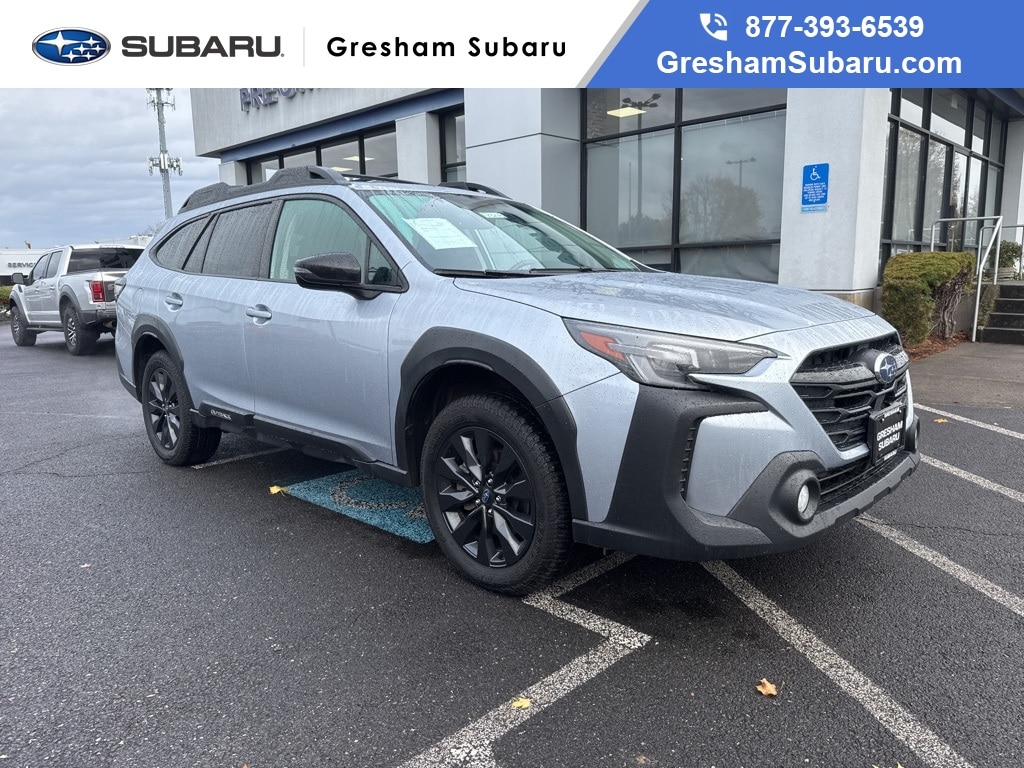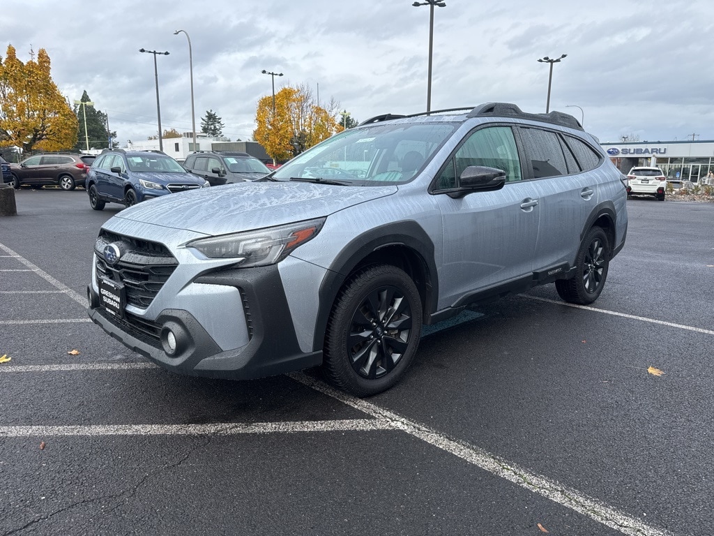 4-Wheel Disc Brakes, 4.111 Axle Ratio, 6 Speakers, ABS brakes, Air Conditioning, All-Weather Floor Liners, Alloy wheels, AM/FM radio: SiriusXM, Auto High-beam Headlights, Auto-Dimming Exterior Mirror w/Approach Light, Auto-dimming Rear-View mirror, Automatic temperature control, Brake assist, Bumpers: body-color, Compass, Driver door bin, Driver vanity mirror, Dual front impact airbags, Dual front side impact airbags, Electronic Stability Control, Emergency communication system: STARLINK Safety Plus (3-year free trial), Exterior Parking Camera Rear, Four wheel independent suspension, Front anti-roll bar, Front Bucket Seats, Front Center Armrest w/Storage, Front dual zone A/C, Front fog lights, Front reading lights, Fully automatic headlights, Garage door transmitter: HomeLink, Heated door mirrors, Heated Front Bucket Seats, Heated front seats, Heated rear seats, Illuminated entry, Knee airbag, Leather Shift Knob, Leather steering wheel, Low tire pressure warning, Navigation System, Occupant sensing airbag, Outside temperature display, Overhead airbag, Overhead console, Panic alarm, Passenger door bin, Passenger vanity mirror, Power door mirrors, Power driver seat, Power Liftgate, Power moonroof, Power passenger seat, Power steering, Power windows, Radio: Subaru STARLINK 11.6" Multimedia Nav System, Rear anti-roll bar, Rear Seat Back Protector, Rear seat center armrest, Rear window defroster, Rear window wiper, Remote keyless entry, Roof rack, Security system, Speed control, Speed-sensing steering, Split folding rear seat, Spoiler, StarTex-Trimmed Upholstery, Steering wheel mounted audio controls, Steering Wheel Paddle Shift Control Switches, Tachometer, Telescoping steering wheel, Tilt steering wheel, Traction control, Trip computer, Turn signal indicator mirrors, Variably intermittent wipers, Wheels: 18" x 7J Black Aluminum Alloy, Power Moonroof, Power Moonroof & Navigation & RAB, Reverse Automatic Braking (RAB) System. 2023 Subaru Outback Onyx Edition XT 4D Sport Utility 2.4L DOHC CVT Lineartronic AWD Ice Silver Metallic Subaru Certified Pre-Owned Details: