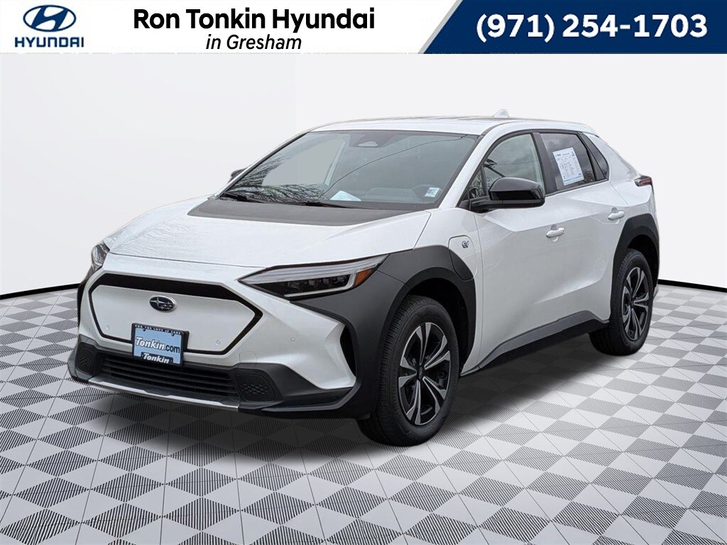 2023 Subaru Solterra Premium Electric Motor 1-Speed Automatic AWD 4D Sport Utility Cosmic White Pearl 13.8 Axle Ratio, 4-Wheel Disc Brakes, 6 Speakers, ABS brakes, Air Conditioning, Alloy wheels, AM/FM radio: SiriusXM, Auto High-beam Headlights, Auto-dimming Rear-View mirror, Automatic temperature control, Brake assist, Bumpers: body-color, Cloth Upholstery, Driver door bin, Driver vanity mirror, Dual front impact airbags, Dual front side impact airbags, Electronic Stability Control, Emergency communication system: Subaru Solterra Connect - Safety Connect (1 year trial included), Exterior Parking Camera Rear, Four wheel independent suspension, Front anti-roll bar, Front Bucket Seats, Front Center Armrest, Front dual zone A/C, Front reading lights, Fully automatic headlights, Heated door mirrors, Heated Front Bucket Seats, Heated front seats, Illuminated entry, Knee airbag, Leather steering wheel, Low tire pressure warning, Occupant sensing airbag, Outside temperature display, Overhead airbag, Overhead console, Panic alarm, Passenger door bin, Passenger vanity mirror, Power door mirrors, Power steering, Power windows, Radio data system, Radio: Subaru Solterra Connect 8.0" Multimedia System, Rear anti-roll bar, Rear reading lights, Rear seat center armrest, Rear window defroster, Remote keyless entry, Security system, Speed control, Speed-sensing steering, Split folding rear seat, Spoiler, Standard Model, Steering wheel mounted audio controls, Telescoping steering wheel, Tilt steering wheel, Traction control, Trip computer, Variably intermittent wipers, Wheels: 18" x 7.5" J Aluminum-Alloy. Call for availability. Come in to Ron Tonkin Gresham Hyundai to test drive today! DA2028 View our entire inventory at https://www.rontonkinhyundai.com/