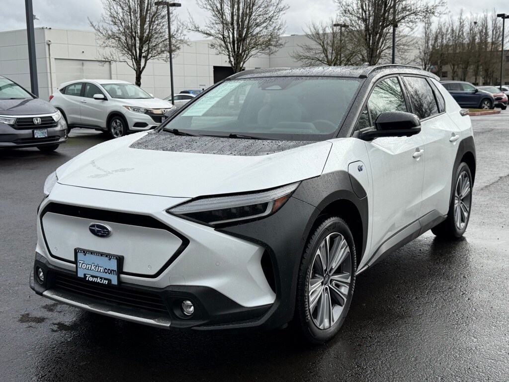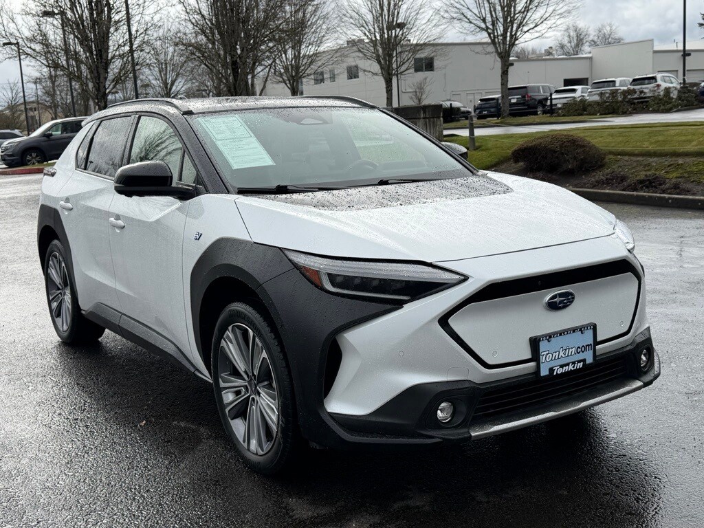 11 Speakers, 13.8 Axle Ratio, 4-Wheel Disc Brakes, ABS brakes, Air Conditioning, All-Weather Floor Liners, Alloy wheels, AM/FM radio: SiriusXM, Auto High-beam Headlights, Auto-dimming Rear-View mirror, Automatic temperature control, Brake assist, Bumpers: body-color, Cargo Tray, Driver door bin, Driver vanity mirror, Dual front impact airbags, Dual front side impact airbags, Electronic Stability Control, Emergency communication system: Subaru Solterra Connect - Safety Connect (1 year trial included), Four wheel independent suspension, Front anti-roll bar, Front Bucket Seats, Front Center Armrest, Front dual zone A/C, Front fog lights, Front reading lights, Fully automatic headlights, Garage door transmitter: HomeLink, harman/kardon® Speakers, Heated & Ventilated Front Bucket Seats, Heated door mirrors, Heated front seats, Heated rear seats, Heated steering wheel, Illuminated entry, Knee airbag, Leather steering wheel, Low tire pressure warning, Memory seat, Navigation system: Cloud Navigation System (Subscription required), Occupant sensing airbag, Outside temperature display, Overhead airbag, Overhead console, Panic alarm, Passenger door bin, Passenger vanity mirror, Power door mirrors, Power driver seat, Power Liftgate, Power steering, Power windows, Radio data system, Radio: Subaru Solterra Connect 12.3" Multimedia System, Rain sensing wipers, Rear anti-roll bar, Rear reading lights, Rear seat center armrest, Rear window defroster, Remote keyless entry, Security system, Speed control, Speed-sensing steering, Split folding rear seat, Spoiler, Standard Model, StarTex Upholstery, Steering wheel mounted audio controls, Telescoping steering wheel, Tilt steering wheel, Traction control, Trip computer, Turn signal indicator mirrors, Variably intermittent wipers, Ventilated front seats, Wheels: 20" x 7.5" J Aluminum-Alloy Gray Finish.