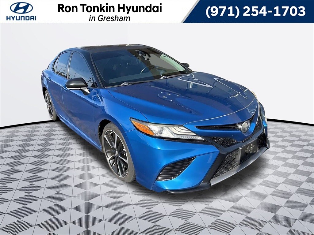 2019 Toyota Camry XSE 2.5L I4 DOHC 16V 8-Speed Automatic FWD 4D Sedan Blue Streak/Midnight Black Metallic Black Leather, Exterior Parking Camera Rear, Panoramic Roof, Spoiler, 4-Wheel Disc Brakes, 6 Speakers, ABS brakes, Air Conditioning, Alloy wheels, AM/FM radio: SiriusXM, Apple CarPlay, Auto High-beam Headlights, Auto-dimming Rear-View mirror, Automatic temperature control, Brake assist, Bumpers: body-color, CD player, Compass, Delay-off headlights, Driver door bin, Driver vanity mirror, Dual front impact airbags, Dual front side impact airbags, Electronic Stability Control, Emergency communication system: Safety Connect, Four wheel independent suspension, Front anti-roll bar, Front Bucket Seats, Front Center Armrest, Front dual zone A/C, Front reading lights, Fully automatic headlights, Garage door transmitter: HomeLink, Heated door mirrors, Heated front seats, Illuminated entry, Knee airbag, Leather Shift Knob, Low tire pressure warning, Multi-Stage Heated Front Bucket Seats, Occupant sensing airbag, Outside temperature display, Overhead airbag, Overhead console, Panic alarm, Passenger door bin, Passenger vanity mirror, Perforated Leather Seat Trim, Power door mirrors, Power driver seat, Power passenger seat, Power steering, Power windows, Radio data system, Radio: Entune 3.0 Audio Plus w/App Suite, Rear anti-roll bar, Rear reading lights, Rear seat center armrest, Rear side impact airbag, Rear window defroster, Remote keyless entry, Security system, Speed control, Speed-sensing steering, Split folding rear seat, Sport steering wheel, Steering wheel mounted audio controls, Tachometer, Telescoping steering wheel, Tilt steering wheel, Traction control, Trip computer, Turn signal indicator mirrors, Variably intermittent wipers, Wheels: 8.0J x 19" Black Machined-Finish Alloy, Black Leather, Exterior Parking Camera Rear, Panoramic Roof, Spoiler. Clean CARFAX. Call for availability. Come in to Ron Tonkin Gresham Hyundai to test drive today! DA2028 View our entire inventory at https://www.rontonkinhyundai.com/