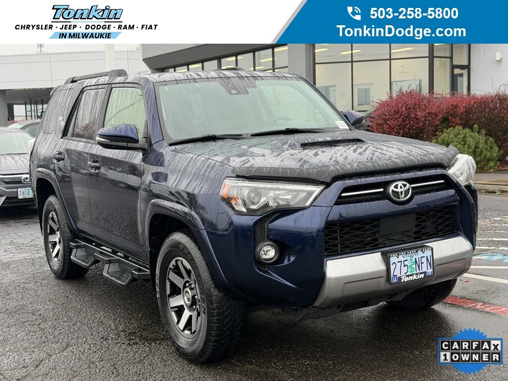 CARFAX One-Owner. Clean CARFAX. 2022 Toyota 4Runner TRD Off-Road Premium 4.0L V6 DOHC 24V 5-Speed with ECT 4WD 4D Sport Utility Nautical Blue Metallic 4WD, Kinetic Dynamic Suspension System (KDSS), 3.727 Axle Ratio, 4-Wheel Disc Brakes, 8 Speakers, ABS brakes, Air Conditioning, AM/FM radio: SiriusXM, Anti-whiplash front head restraints, Apple CarPlay/Android Auto, Auto High-beam Headlights, Auto-dimming Rear-View mirror, Black Roof Rails, Blind Spot Monitor (BSM), Brake assist, Bumpers: body-color, Compass, Custom Fuel Wheels and Off-Road Tires, Driver door bin, Driver vanity mirror, Dual front impact airbags, Dual front side impact airbags, Electronic Stability Control, Emergency communication system: Safety Connect with 1-year trial, Exterior Parking Camera Rear, Front anti-roll bar, Front Bucket Seats, Front Center Armrest, Front fog lights, Front reading lights, Front wheel independent suspension, Garage Door Opener, Garage door transmitter: HomeLink, Heated door mirrors, Heated Front Bucket Seats, Heated front seats, Illuminated entry, Knee airbag, Leather Shift Knob, Low tire pressure warning, Occupant sensing airbag, Outside Rear View Mirror, Outside temperature display, Overhead airbag, Overhead console, Panic alarm, Passenger door bin, Passenger vanity mirror, Power door mirrors, Power driver seat, Power passenger seat, Power steering, Power windows, Radio: Premium Audio w/Dynamic Navigation, Rear anti-roll bar, Rear seat center armrest, Rear window defroster, Rear window wiper, Remote keyless entry, Roof rack, Security system, SofTex Seat Trim, Speed control, Speed-sensing steering, Split folding rear seat, Spoiler, Steering wheel mounted audio controls, Tachometer, Telescoping steering wheel, Tilt steering wheel, Traction control, Trip computer, Turn signal indicator mirrors, Variably intermittent wipers, Wheels: 17" Unique 7-Spoke Off-Road Alloy, 4WD, Kinetic Dynamic Suspension System (KDSS). ***Call (503) 258-5800 to speak to a Sales Professional*** Come in to Ron Tonkin Chrysler Jeep Dodge Ram Fiat in Milwaukie to test drive today! DL0087.