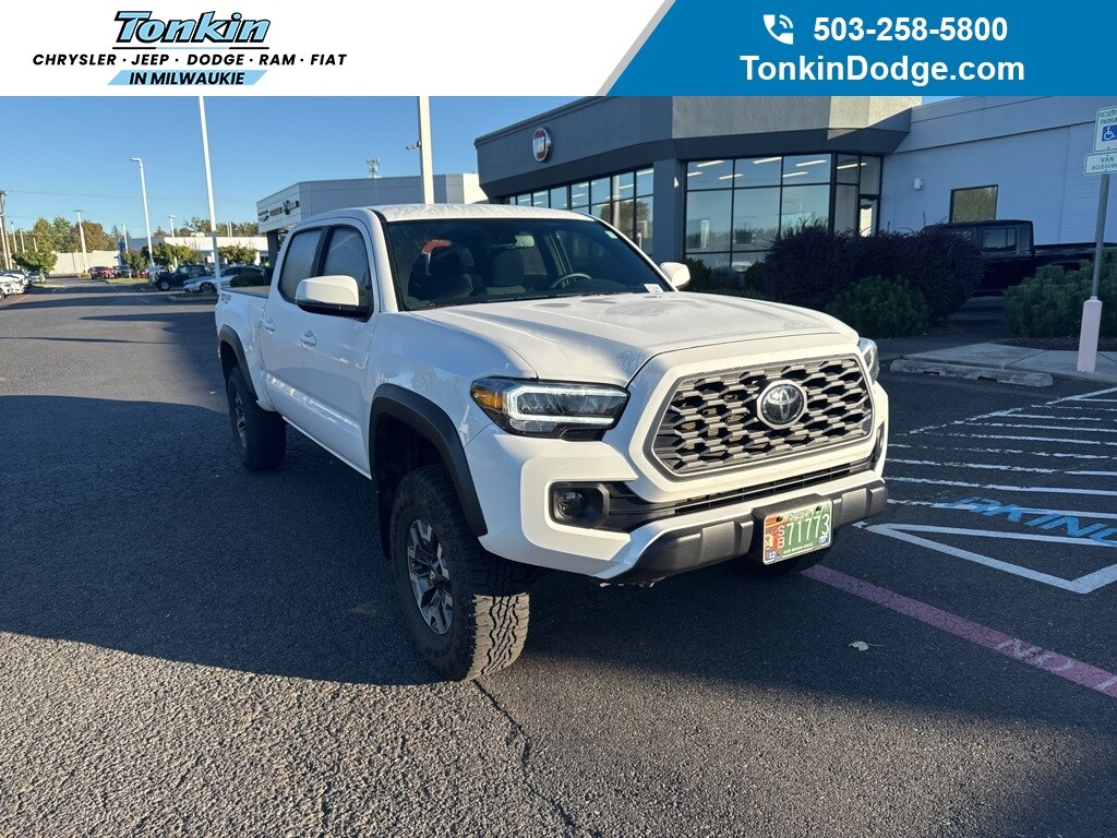 Recent Arrival! CARFAX One-Owner. Clean CARFAX. 2023 Toyota Tacoma V6 3.5L V6 6-Speed Automatic 4WD 4D Double Cab Ice Cap 4WD, 120V/400W Deck Mounted AC Power, Black Overfenders, Engine Immobilizer, TRD Off Road Package, 6 Speakers, ABS brakes, Air Conditioning, AM/FM radio: SiriusXM, Anti-whiplash front head restraints, Apple CarPlay/Android Auto, Auto High-beam Headlights, Auto-dimming Rear-View mirror, Automatic temperature control, Axle Ratio: 3.91, Brake assist, Bumpers: body-color, Custom Fuel Wheels and Off-Road Tires, Driver door bin, Dual front impact airbags, Dual front side impact airbags, Electronic Stability Control, Emergency communication system: Safety Connect (1-year trial), Exterior Parking Camera Rear, Fabric Seat Trim, Front anti-roll bar, Front Bucket Seats, Front Center Armrest, Front dual zone A/C, Front fog lights, Front reading lights, Front Seats, Front wheel independent suspension, Heated door mirrors, Illuminated entry, Knee airbag, Leather Shift Knob, Low tire pressure warning, Occupant sensing airbag, Outside temperature display, Overhead airbag, Overhead console, Panic alarm, Passenger door bin, Power door mirrors, Power driver seat, Power steering, Power windows, Radio: Audio, Rear step bumper, Remote keyless entry, Security system, Speed control, Speed-sensing steering, Split folding rear seat, Steering wheel mounted audio controls, Tachometer, Telescoping steering wheel, Tilt steering wheel, Traction control, Trip computer, Turn signal indicator mirrors, Variably intermittent wipers, Wheels: 16" Machined Contrast Alloy, Long Bed, 4WD, 120V/400W Deck Mounted AC Power, Black Overfenders, Engine Immobilizer, TRD Off Road Package. ***Call (503) 258-5800 to speak to a Sales Professional*** Come in to Ron Tonkin Chrysler Jeep Dodge Ram Fiat in Milwaukie to test drive today! DL0087.