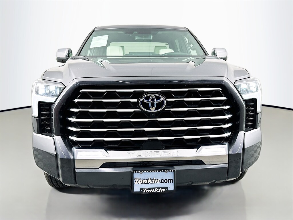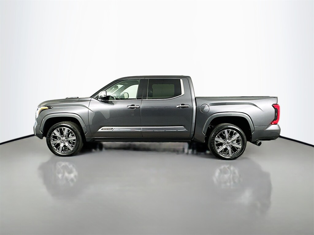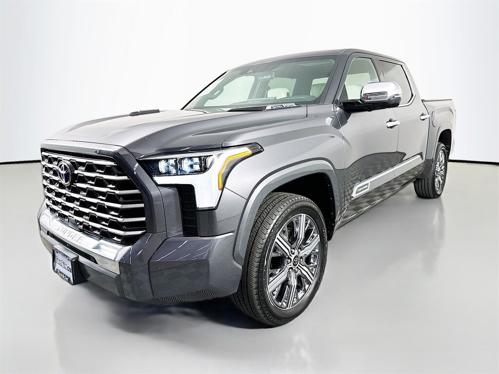 Magnetic Gray Metallic 2023 Toyota Tundra Hybrid Capstone 4D Crew Cab 3.4L V6 10-Speed Automatic 4WD Android Auto, Apple CarPlay, Leather, Keyless Entry, Blind Spot, Back Up Camera, Heated Seats, BlueTooth, 3.4L V6, 12 Speakers, 3.31 Axle Ratio, 4-Wheel Disc Brakes, ABS brakes, Air Conditioning, Alloy wheels, AM/FM radio: SiriusXM, Apple CarPlay/Android Auto, Auto High-beam Headlights, Auto-dimming door mirrors, Auto-dimming Rear-View mirror, Automatic temperature control, Brake assist, Bumpers: body-color, Compass, Delay-off headlights, Driver door bin, Driver vanity mirror, Dual front impact airbags, Dual front side impact airbags, Electronic Stability Control, Emergency communication system: Safety Connect (10-year trial), Front anti-roll bar, Front Bucket Seats, Front Center Armrest, Front dual zone A/C, Front fog lights, Front reading lights, Front wheel independent suspension, Fully automatic headlights, Garage door transmitter: HomeLink, Heads-Up Display, Heated & Ventilated Front Bucket Seats, Heated door mirrors, Heated front seats, Heated rear seats, Heated steering wheel, Illuminated entry, Knee airbag, Leather Shift Knob, Low tire pressure warning, Memory seat, Navigation System, Occupant sensing airbag, Outside temperature display, Overhead airbag, Overhead console, Panic alarm, Passenger door bin, Passenger vanity mirror, Power door mirrors, Power driver seat, Power moonroof, Power passenger seat, Power steering, Power windows, Radio data system, Radio: Premium Audio w/JBL, Rain sensing wipers, Rear reading lights, Rear seat center armrest, Rear step bumper, Rear window defroster, Remote keyless entry, Security system, Semi-Aniline Leather Seat Trim, Speed control, Speed-sensing steering, Split folding rear seat, Steering wheel memory, Steering wheel mounted audio controls, Tachometer, Telescoping steering wheel, Tilt steering wheel, Traction control, Trip computer, Turn signal indicator mirrors, Variably intermittent wipers, Ventilated front seats, Ventilated rear seats, Voltmeter, Wheels: 22" Dark Chrome Alloy, 3.4L V6.