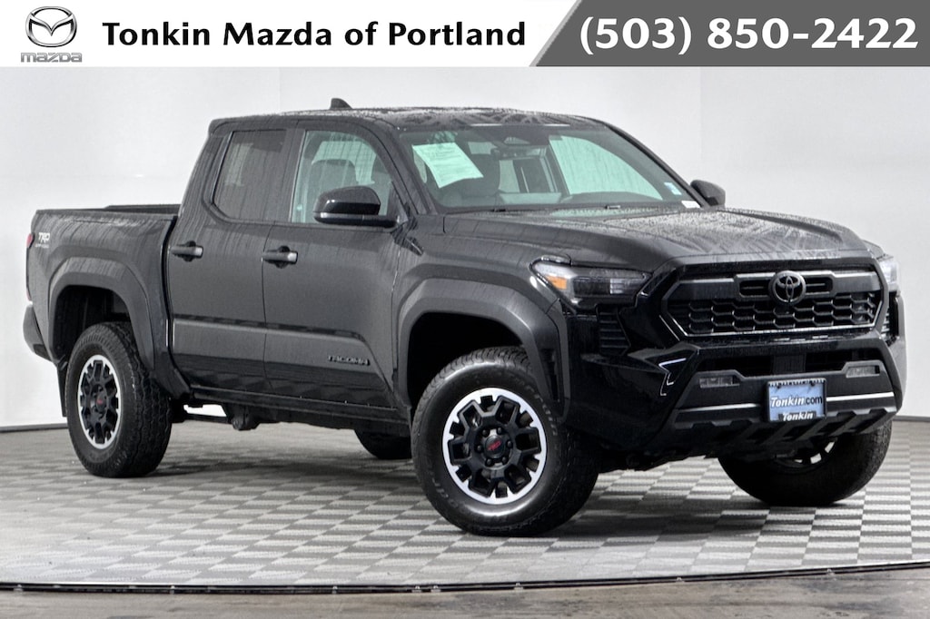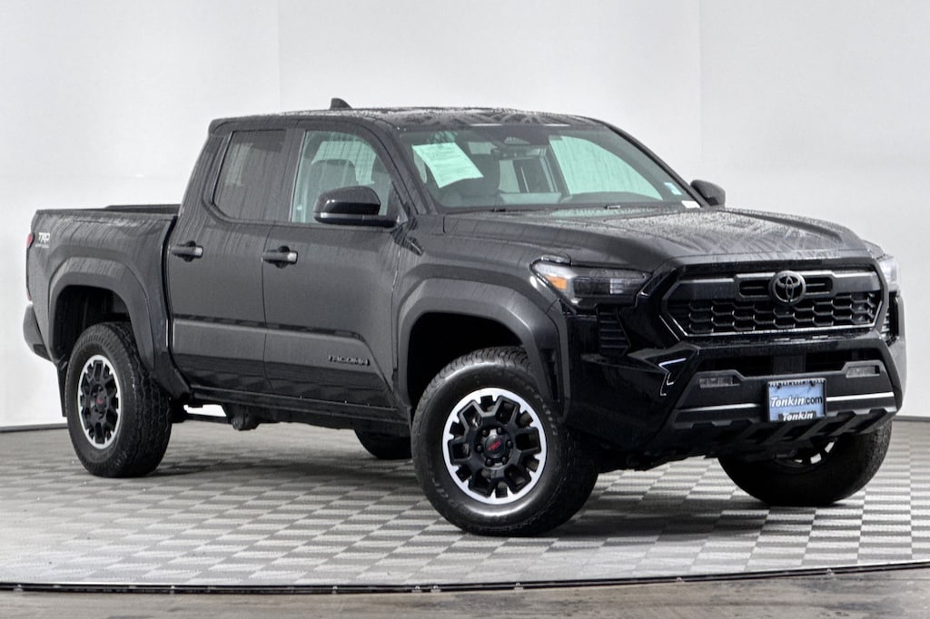 CARFAX One-Owner. Black 2024 Toyota Tacoma TRD Off-Road 4D Double Cab 2.4L 4-Cylinder 8-Speed Automatic 4WD Android Auto, Apple CarPlay, Keyless Entry, Back Up Camera, Heated Seats, BlueTooth, 4WD, 4-Wheel Disc Brakes, 6 Speakers, ABS brakes, Air Conditioning, Alloy wheels, AM/FM radio: SiriusXM, Anti-whiplash front head restraints, Apple CarPlay/Android Auto, Auto High-beam Headlights, Auto-dimming Rear-View mirror, Automatic temperature control, Backup Camera, Brake assist, Bumpers: body-color, Driver door bin, Driver vanity mirror, Dual front impact airbags, Dual front side impact airbags, Electronic Stability Control, Emergency communication system: Safety Connect (1-year trial), Fabric Seat Trim (FD), Four wheel independent suspension, Front anti-roll bar, Front Bucket Seats, Front Center Armrest, Front fog lights, Front reading lights, Fully automatic headlights, Heated door mirrors, Illuminated entry, Knee airbag, Leather Shift Knob, Leather steering wheel, Low tire pressure warning, Occupant sensing airbag, Outside temperature display, Overhead airbag, Overhead console, Panic alarm, Passenger vanity mirror, Power door mirrors, Power steering, Power windows, Radio: 8" Toyota Audio Multimedia, Rear step bumper, Remote keyless entry, Security system, Speed control, Speed-sensing steering, Steering wheel mounted audio controls, Tachometer, Telescoping steering wheel, Tilt steering wheel, Traction control, Trip computer, Turn signal indicator mirrors.